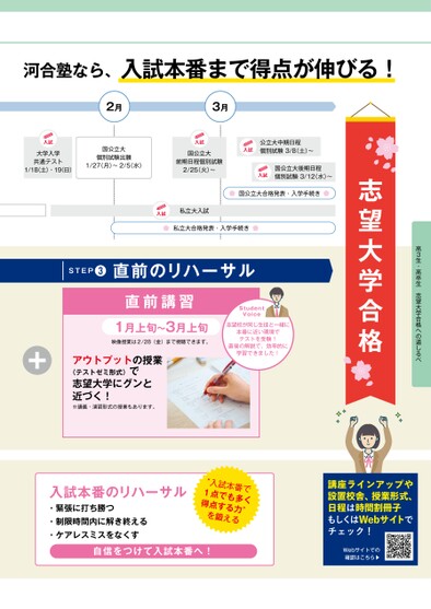 高3生・高卒生志望大学合格への道しるべ志望大学合格2月入試大学入学共通テスト1/18(土)・19(日)国公立大個別試験出願1/27(月)〜2/5(水)3月入試国公立大前期日程個別試験2/25(火)〜公立大中期日程個別試験3/8(土)〜入試国公立大後期日程個別試験3/12(水)〜入試国公立大合格発表・入学手続き入試私立大入試私立大合格発表・入学手続きSTEP❸直前のリハーサル直前講習1月上旬〜3月上旬映像授業は2/28(金)まで視聴できます。アウトプットの授業(テストゼミ形式)で志望大学にグンと近づく!※講義・演習形式の授業もあります。StudentVoice志望校が同じ生徒と一緒に本番に近い環境でテストを受験!直後の解説で、効率的に学習できました!河合塾なら、入試本番まで得点が伸びる!入試本番のリハーサル・緊張に打ち勝つ・制限時間内に解き終える・ケアレスミスをなくす“入試本番で1点でも多く得点する力”を鍛える自信をつけて入試本番へ!講座ラインアップや設置校舎、授業形式、日程は時間割冊子もしくはWebサイトでチェック!Webサイトでの確認はこちら▶