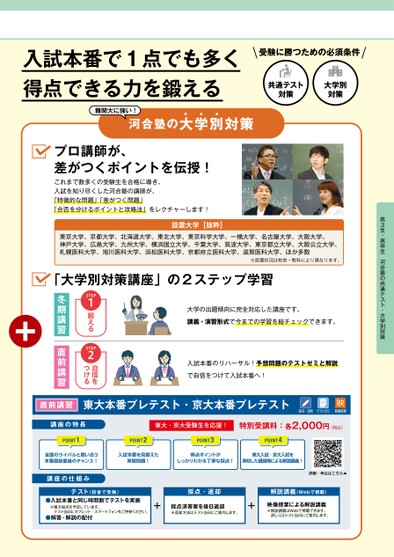 高3生・高卒生河合塾の共通テスト・大学別対策設置大学【抜粋】東京大学、京都大学、北海道大学、東北大学、東京科学大学、一橋大学、名古屋大学、大阪大学、神戸大学、広島大学、九州大学、横浜国立大学、千葉大学、筑波大学、東京都立大学、大阪公立大学、札幌医科大学、旭川医科大学、浜松医科大学、京都府立医科大学、滋賀医科大学、ほか多数※設置状況は校舎・教科により異なります。「大学別対策講座」の2ステップ学習大学の出題傾向に完全対応した講座です。講義・演習形式で今までの学習を総チェックできます。入試本番のリハーサル!予想問題のテストゼミと解説で自信をつけて入試本番へ!STEP1鍛えるSTEP2自信をつける冬期講習直前講習直前講習東大本番プレテスト・京大本番プレテスト採点・添削テストゼミ映映像授業講座の特長POINT1東大・京大受験生を応援!特別受講料:各2,000円(税込)POINT2POINT3POINT4全国のライバルと競い合う本番直前最後のチャンス!入試本番を見据えた実戦問題!得点ポイントがしっかりわかる丁寧な採点!東大入試・京大入試を熟知した講師陣による解説講義!講座の仕組み詳細・申込はこちら▲プロ講師が、差がつくポイントを伝授!これまで数多くの受験生を合格に導き、入試を知り尽くした河合塾の講師が、「特徴的な問題」「差がつく問題」「合否を分けるポイントと攻略法」をレクチャーします!入試本番で1点でも多く得点できる力を鍛える受験に勝つための必須条件共通テスト対策大学別対策難関大に強い!河合塾の大学別対策テスト(校舎で受験)●入試本番と同じ時間割でテストを実施※電子採点を予定しています。テスト当日にタブレット・スマートフォンをご持参ください。●解答・解説の配付採点・返却+採点済答案を後日返却※返却方法はテスト当日にご案内します。+解説講義(Webで視聴)映像授業による解説講義※解説講義はWebで視聴できます。詳しくはテスト当日にご案内します。