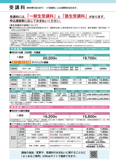 受講料(教材費を含みます)※「受講料」には消費税を含みます。受講料には、「一般生受講料」と「塾生受講料」があります。申込講座数に応じてお支払いください。[塾生受講料の適用について]お申し込みが可能です。●2024年度ならびに2025年度河合塾生の方で、講習申込時に入塾手続を完了されている方は、塾生受講料(割引料金)で河合塾生とは、右記河合塾グループ在籍者を示します。●河合塾大学受験科●高校グリーンコース●MEPLO●K会●小学・中学グリーンコース●河合塾NEXT●河合塾Winɡs●英検対策講座&サイエンス講座●海外帰国生コース●河合塾美術研究所(本科・専科)●COSMO●サポートコース●河合塾マナビス●河合塾KALS●ドルトンスクール●トライデント●日能研東海●エコール・ドゥ・アンファン●日米英語学院●河合塾One●アーネスト英語学院●メディカルラボ※K会、英検対策講座&サイエンス講座、海外帰国生コース、河合塾KALS、トライデント、日能研東海、エコール・ドゥ・アンファン、日米英語学院、河合塾One、アーネスト英語学院、メディカルラボに在籍の場合、インターネット申込では塾生受講料は適用されません。塾生証または会員証など受講を確認できるものを持参のうえ、窓口へお申し出ください。河合塾Oneに在籍の場合は、河合塾One受講画面のマイページで確認します。窓口へお申し出ください。※英検は公益財団法人日本英語検定協会の登録商標です。このコンテンツは、公益財団法人日本英語検定協会の承認や推奨、その他の検討を受けたものではありません。※おすすめ受講プランのセット講座は、選択した講座数に応じた受講料です。冬期講習●90分×5講(5日間)の講座1講座一般生受講料20,200円●高1生・高2生対象ダイジェスト講座講座形式2講完結90分×2講講座名●【ダイジェスト】冬から始める入試対策英語(難関・標準)●【ダイジェスト】冬から始める入試対策数学(難関・標準)塾生受講料19,700円一般生受講料各500円塾生受講料各500円※塾生優先申込期間にはお申し込みになれません。●以下の講座は上記受講料と異なります。2講完結3講完結講座形式90分×2講60分×3講90分×3講一般生受講料8,000円8,000円12,000円塾生受講料7,800円7,800円11,700円講座形式4講完結10講完結90分×4講90分×10講一般生受講料16,200円40,400円塾生受講料15,800円39,400円●共通テスト本番リハーサル講座学年高3生高卒生講座形式1科目3教科型5教科型6教科型一般生受講料8,000円18,000円29,800円35,000円塾生受講料7,800円16,800円27,800円32,600円※東北・関東で設置している対面型の「共通テスト本番リハーサル講座」はセット料金の適用はできません。●個別指導講座地域・設置校舎中四国/九州(広島校・福岡校)九州(福岡校)学年高1生高2生高3生科目英語・数学物理・化学英語・数学物理・化学一般生受講料各36,500円各35,000円塾生受講料各40,000円各39,000円直前講習(直前講習は高3生・高卒生のみ対象です)※おすすめ受講プランのセット講座は、選択した講座数に応じた受講料です。●90分×4講の講座1講座一般生受講料16,200円塾生受講料15,800円2024年度高校グリーンコース高3生は、特典として「直前講習(90分×4講)を1講座無料」で受講できます(一部の講座を除く/在籍地区設置講座のみ)。なお、特典のご利用には条件があります。詳細は校舎へお問い合わせください。●以下の講座は上記受講料と異なります。他の講座と併せて受講される場合には、以下の金額をそれぞれ加算してください。学年講座形式1日完結2講完結地域・設置校舎全地域全地域全5講中四国(広島校)九州(福岡校・北九州現役館)高3生高卒生講座名●共通テスト本番突破テスト講座90分×2講の講座●広大英語●広大理系数学●京大地歴直前添削日本史/世界史/地理全地域●東大本番プレテスト・京大本番プレテスト東海(千種校・名駅校)●名大医学科ファイナルテスト講座の追加/変更や、受講料のお支払いに関することなど「よくあるご質問」はWebサイトで確認できます。一般生受講料8,000円8,000円各20,200円各3,000円塾生受講料7,800円7,800円各19,700円各3,000円東大・京大受験生を応援!特別受講料:各2,000円名大医学科受験生を応援!特別受講料:2,000円