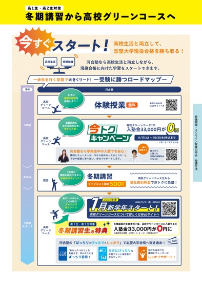 高1生・高2生対象冬期講習から高校グリーンコースへ今すぐスタート!高校生活と両立して、志望大学現役合格を勝ち取る!高校生活受験勉強河合塾なら高校生活と両立しながら、現役合格に向けた学習をスタートできます。一歩先を行く学習で大きくリード!ー受験に勝つロードマップーまずは実際の授業を体験しよう!河合塾体験授業無料お申し込みはWebサイトへ▶高校グリーンコース学校2学期映像授業・オンライン授業の申込・受講方法高校グリーンコース※の入塾金33,000円が円09/17(火)〜10/31(木)申込まで※高1生・高2生対象一緒に頑張ろう途中から入塾した先輩の体験談はこちら▶高校グリーンコース生なら塾生割引料金でおトクに受講!基盤固め&苦手克服のため、今すぐ入塾!高校グリーンコース今トクキャンペーン河合塾なら学期途中の入塾でも安心!講師とチューターが、今から始める一人ひとりの不安や課題に寄り添い、全力でサポートします。冬休み講習2学期の課題を解決するなら、冬休みがチャンス!差をつけるなら、この1月がターニングポイント!!冬期講習ダイジェスト講座(税込)500円12025年度月新学年スタート!高校グリーンコースについて詳しくはWebサイトへ2024/11/15(金)OPEN▶3学期スタート高校グリーンコース高1生・高2生対象冬期講習の手続き完了後、高校グリーンコースに入塾すると入塾金33,000円が円に※最終申込期限:2025/1/4(土)入塾申込まで0河合塾の「ばっちり×ぴったり×しっかり」で志望大学合格へ突き進め!GOG!!O「わかったつもり」を見逃さず、学んだことをばっちり習得!自分にぴったりな学習プランと演習量で学力アップ!塾でも自宅でも講師とチューターがしっかりサポート!