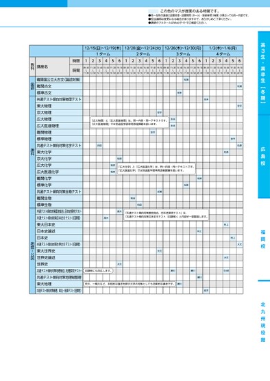 ●同一名称の講座は設置校舎・設置期間(ターム)・授業時間(時限)が異なっても同一内容です。●担当講師は変更になる場合がありますので、あらかじめご了承ください。●講師のフルネームはWebサイトでご確認ください。この色のマスが授業のある時限です。12/15(日)~12/19(木)12/20(金)~12/24(火)12/26(木)~12/30(月)1/2(木)~1/6(月)1ターム2ターム3ターム4ターム12345612345612345612345609:30〜11:0011:20〜12:5013:40〜15:1015:30〜17:0017:20〜18:5019:10〜20:4009:30〜11:0011:20〜12:5013:40〜15:1015:30〜17:0017:20〜18:5019:10〜20:4009:30〜11:0011:20〜12:5013:40〜15:1015:30〜17:0017:20〜18:5019:10〜20:4009:30〜11:0011:20〜12:5013:40〜15:1015:30〜17:0017:20〜18:5019:10〜20:40時限時間講座名難関国公立大古文(論述対策)難関古文標準古文共通テスト傾向対策物理テスト東大物理京大物理広大物理広大医進物理難関物理標準物理共通テスト傾向対策化学テスト東大化学京大化学広大化学広大医進化学難関化学標準化学共通テスト傾向対策生物テスト難関生物標準生物共通テスト傾向対策歴史総合,日本史探究テスト共通テスト傾向対策日本史Bテスト(旧課程)東大日本史日本史論述日本史共通テスト傾向対策世界史Bテスト(旧課程)東大世界史世界史論述世界史共通テスト傾向対策地理総合,地理探究テスト共通テスト傾向対策地理総整理東大地理共通テスト傾向対策倫理,政治・経済テスト(旧課程)松浦岩本永井松浦安平「広大物理」と「広大医進物理」は、同一内容・同一テキストです。「広大医進物理」では別途医学部専用添削課題を扱います。永井永井安平安平浜田松原松原松原「広大化学」と「広大医進化学」は、同一内容・同一テキストです。「広大医進化学」では別途医学部専用添削課題を扱います。松原松原近藤和田和田高木高木「共通テスト傾向対策歴史総合,日本史探求テスト」は、「共通テスト傾向対策日本史Bテスト(旧課程)」と内容が一部重複します。安平松原松原広島校大元大元旧課程にも対応します。瀬川瀬川京大、一橋大など、本格的な論述を課す大学の対策としても効果的な講座です。瀬川村上大元村上大元中土居村上瀬川岩井教科国語理科地歴・公民●2024年度/冬期講習/広島/広島校/高3・卒生/パターン14452024_57_6_611_11_20240711151901.csv/2ページ校了時削除