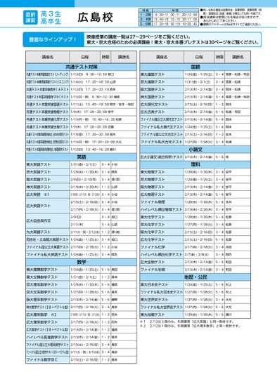 高3生高卒生直前講習●同一名称の講座は設置校舎・設置期間・授業時間(時限)・授業形式(対面・映像)が異なっても同一内容です。●担当講師は変更になる場合がありますので、あらかじめご了承ください。●講師のフルネームはWebサイトでご確認ください。時限時間1・2限3・4限5・6限9:30〜11:00・11:20〜12:5013:40〜15:10・15:30〜17:0017:20〜18:50・19:10〜20:40広島校講座名日程時限講師名講座名日程時限講師名共通テスト対策共通テスト本番突破英語テスト(リーディング)1/12(日)09:30〜12:50坂口9:01250坂口共通テスト本番突破英語テスト(リスニング)1/14(火)17:20〜18:50山添共通テスト本番突破数学ⅠAテスト1/12(日)17:20〜20:10森本共通テスト本番突破数学ⅡBCテスト1/13(月・祝)9:30〜12:20樋原093〜1:20原東大国語テスト京大国語テスト阪大国語テスト神大国語テスト国語1/24(金)・1/25(土)3・4莵原・松浦・寺田1/31(金)・2/1(土)3・4莵原・松浦2/13(木)・2/14(金)3・4岡本・松浦2/13(木)・2/14(金)3・4莵原・松浦・寺田共通テスト本番突破国語テスト1/11(土)13:40〜19:50岡本・岩本・寺田広大現代文テスト2/15(土)・2/16(日)1・2岡本共通テスト本番突破物理テスト1/9(木)17:20〜20:00安平広大古典テスト2/13(木)・2/14(金)5・6松浦・寺田共通テスト本番突破化学テスト1/13(月・祝)13:40〜16:20松原ファイナル国公立大現代文テスト2/13(木)・2/14(金)5・6岡本共通テスト本番突破生物テスト1/9(木)17:20〜20:00近藤ファイナル私大現代文テスト1/24(金)・1/25(土)5・6岡本共通テスト本番突破歴史総合,日本史探究テスト1/10(金)17:20〜20:00高木ファイナル国公立大古文テスト2/15(土)・2/16(日)1・2岩本共通テスト本番突破歴史総合,世界史探究テスト1/13(月・祝)17:20〜20:00大元ファイナル私大古文テスト1/27(月)・1/28(火)3・4松浦共通テスト本番突破地理総合,地理探究テスト1/12(日)13:40〜16:20瀬川東大英語テスト京大英語テスト阪大英語テスト神大英語テスト広大英語※1広大英語テスト広大自由英作文九大英語テスト英語1/31(金)・2/1(土)3・4小谷1/29(水)・1/30(木)3・4岡本2/9(日)・2/10(月)3・4堤(英)2/19(水)・2/20(木)1・2山添2/10(月)・2/11(火・祝)・2/12(水)3・4小谷2/15(土)・2/16(日)3・4小谷2/9(日)3木)2/9(日)(木)3・4坂口3・4坂口2/11(火・祝)・2/12(水)1・2堤(英)広大小論文(総合科学)テスト2/13(木)・2/14(金)5・6桂小論文東大物理テスト京大物理テスト阪大物理テスト広大物理テストファイナル物理理科1/29(水)・1/30(木)3・4安平1/24(金)・1/25(土)3・4安平2/13(木)・2/14(金)3・4安平2/13(木)・2/14(金)5・6安平1/29(水)・1/30(木)5・6永井東大化学テスト京大化学テスト阪大化学テスト広大化学テストファイナル化学1/29(水)・1/30(木)5・6松原1/27(月)・1/28(火)3・4松原2/15(土)・2/16(日)3・4松原2/15(土)・2/16(日)5・6松原2/17(月)・2/18(火)3・4浜田2/17(月)・2/18(火)3・4堤(英)ハイレベル頻出物理テスト2/19(水)・2/20(木)3・4安平同志社・立命館大英語テスト1/24(金)・1/25(土)3・4坂口ファイナル国公立大英語テスト2/17(月)・2/18(火)1・2小谷ファイナル私大英語テスト1/24(金)・1/25(土)3・4岡本ハイレベル頻出化学テスト2/7(金)・2/8(土)3・4岡内東大理類数学テスト東大文類数学テスト京大理系数学テスト京大文系数学テスト阪大理系数学テスト数学1/24(金)・1/25(土)5・6黒田1/31(金)・2/1(土)1・2森本1/29(水)・1/30(木)5・6樋原1/27(月)・1/28(火)5・6森本2/13(木)・2/14(金)5・6藤野広大生物テストファイナル生物2/13(木)・2/14(金)5・6和田2/13(木)・2/14(金)3・4和田地歴・公民東大日本史テスト1/24(金)・1/25(土)5・6村上ファイナル私大日本史テスト1/27(月)・1/28(火)5・6村上東大世界史テスト1/27(月)・1/28(火)3・4大元神大数学テスト(ⅡB+ベクトル型)2/17(月)・2/18(火)3・4鳥本ファイナル私大世界史テスト1/27(月)・1/28(火)5・6大元広大理系数学※2広大理系数学テスト2/10(月)・2/11(火・祝)・2/12(水)1・2府木2/17(月)・2/18(火)1・2府木広大数学テスト(ⅡB+ベクトル型)2/13(木)・2/14(金)1・2原樋原ハイレベル医進数学テスト2/13(木)・2/14(金)1・2森本ファイナル国公立大理系数学テスト2/15(土)・2/16(日)3・4鳥本ファイナル国公立大数学テスト(ⅡB+ベクトル型)2/11(火・祝)・2/12(水)3・4鳥本ファイナル数学ⅢC2/15(土)・2/16(日)1・2鳥本東大地理テスト1/29(水)・1/30(木)5・6瀬川※12/12は3限のみ。冬期講習「広大英語」と同一教材です。※22/12は1限のみ。冬期講習「広大理系数学」と同一教材です。