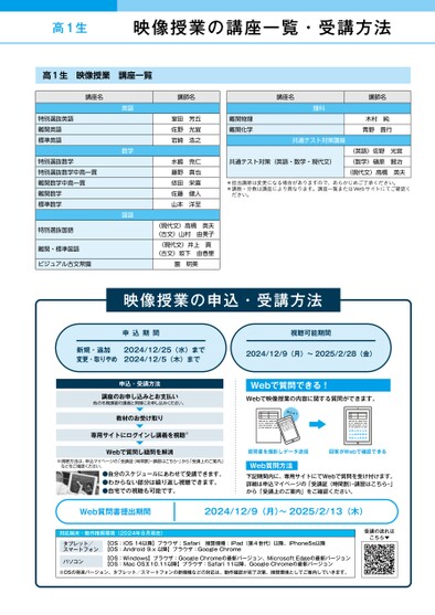 高1生映像授業の講座一覧・受講方法高1生映像授業講座一覧講座名英語数学国語特別選抜英語難関英語標準英語特別選抜数学特別選抜数学中高一貫難関数学中高一貫難関数学標準数学特別選抜国語難関・標準国語ビジュアル古文常識講師名室田芳丘佐野光宜岩崎浩之水嶋克仁藤野真也依田栄喜佐藤健人山本洋至(現代文)高橋英夫(古文)山村由美子(現代文)井上真(古文)坂下由香里園明美講座名理科難関物理難関化学共通テスト対策講座共通テスト対策(英語・数学・現代文)講師名木村純青野貴行(英語)佐野光宜(数学)樋原賢治(現代文)高橋英夫*担当講師は変更になる場合がありますので、あらかじめご了承ください。*講数・分数は講座により異なります。講座一覧またはWebサイトにてご確認ください。映像授業の申込・受講方法申込期間視聴可能期間新規・追加2024/12/25(水)まで変更・取りやめ2024/12/5(木)まで2024/12/9(月)〜2025/2/28(金)申込・受講方法講座のお申し込みとお支払い他の冬期講習の講座と同様にお申し込みください。教材のお受け取り専用サイトにログインし講義を視聴※Webで質問できる!Webで映像授業の内容に関する質問ができます。カシャ!Webで質問し疑問を解消質問書を撮影しデータ送信回答がWebで確認できる※視聴方法は、申込マイページの「受講証(時間割)ー講習はこちらー」から「受講上のご案内」などをご確認ください。●自分のスケジュールにあわせて受講できます。●わからない部分は繰り返し視聴できます。●自宅での視聴も可能です。Web質問方法下記期間内に、専用サイトにてWebで質問を受け付けます。詳細は申込マイページの「受講証(時間割)ー講習はこちらー」から「受講上のご案内」をご確認ください。Web質問書提出期間2024/12/9(月)〜2025/2/13(木)対応端末・動作推奨環境(2024年8月現在)タブレット/スマートフォンパソコン【OS:iOS14以降】ブラウザ:Safari推奨機種:iPad(第4世代)以降、iPhone5s以降【OS:Android9.x以降】ブラウザ:GoogleChrome【OS:Windows】ブラウザ:GoogleChromeの最新バージョン、MicrosoftEdgeの最新バージョン【OS:MacOSⅩ10.11以降】ブラウザ:Safari11以降、GoogleChromeの最新バージョン※OSの将来バージョン、タブレット/スマートフォンの新機種などの対応は、動作確認が完了次第、推奨環境としてご案内していきます。受講の流れはこちら▼