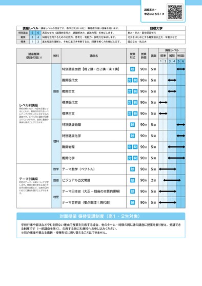 講座案内・申込はこちら!▶講座レベル:講座レベルの目安です。数字が大きいほど、難易度の高い授業を行います。特別選抜難関標準531642高度な学力(論理的思考力、課題解決力、論述力等)を伸ばします。知識を活用するための応用力、思考力・判断力・表現力を伸ばします。基本知識の理解と、それに基づき考察する力、問題を解く力を伸ばします。目標大学東大・京大・医学部医学科北大をはじめとする難関国公立大・早慶大など国公立大・私立大講座種類(講座の狙い)教科講座名授業形式授業時間講数講座レベル標準12難関34特別選抜56特別選抜国語【現2講・古2講・漢1講】映90分5講レベル別講座現役合格に向け、内容を定着させるとともに、現時点の学力をレベルアップさせたい方におすすめの講座です。レベル別に講座が設置されていますので、自身に最適の講座を選ぶことができます。難関現代文国語難関古文標準現代文標準古文特別選抜物理特別選抜化学難関物理難関化学理科テーマ別講座特定のテーマ・分野について学習します。得意分野の更なる強化や苦手分野の克服など、自身の目的に応じて講座を選ぶことができます。数学テーマ数学(ベクトル)国語ビジュアル古文常識テーマ日本史(大正―戦後の本質的理解)地歴テーマ世界史(要点整理!現代史)対映90分5講対映90分5講対映90分5講対映90分5講映映90分5講90分5講対映90分5講対映90分5講映映映映90分5講90分2講90分5講90分5講対面授業振替受講制度(高1・2生対象)学校行事や部活などやむを得ない理由で授業を欠席する場合、他のターム・時限の同じ講の講座に授業を振り替え、受講できる制度です(一部講座を除く)。欠席する前に札幌校へお申し込みください。※別の講座や異なる講数・授業形式に振り替えることはできません。