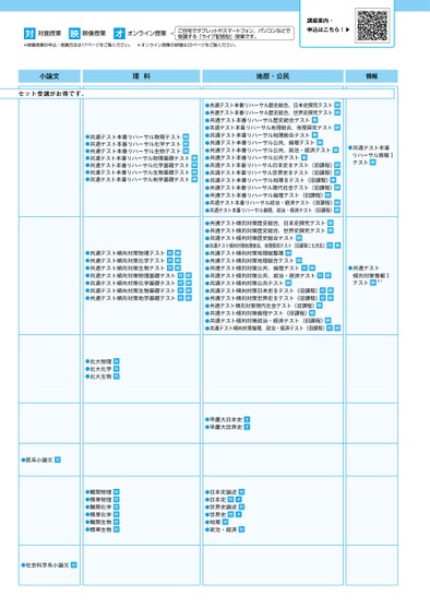 セット受講がお得です。対対面授業映映像授業オオンライン授業ご自宅でタブレットやスマートフォン、パソコンなどで受講する「ライブ配信型」授業です。*映像授業の申込・受講方法は17ページをご覧ください。*オンライン授業の詳細は20ページをご覧ください。講座案内・申込はこちら!▶小論文理科地歴・公民情報●共通テスト本番リハーサル物理テスト映●共通テスト本番リハーサル化学テスト映●共通テスト本番リハーサル生物テスト映●共通テスト本番リハーサル物理基礎テスト映●共通テスト本番リハーサル化学基礎テスト映●共通テスト本番リハーサル生物基礎テスト映●共通テスト本番リハーサル地学基礎テスト映●共通テスト傾向対策物理テスト対映●共通テスト傾向対策化学テスト対映●共通テスト傾向対策生物テスト対映●共通テスト傾向対策物理基礎テスト対映●共通テスト傾向対策化学基礎テスト対映●共通テスト傾向対策生物基礎テスト対映●共通テスト傾向対策地学基礎テスト対映●共通テスト本番リハーサル歴史総合,日本史探究テスト映●共通テスト本番リハーサル歴史総合,世界史探究テスト映●共通テスト本番リハーサル歴史総合テスト映●共通テスト本番リハーサル地理総合,地理探究テスト映●共通テスト本番リハーサル地理総合テスト映●共通テスト本番リハーサル公共,倫理テスト映●共通テスト本番リハーサル公共,政治・経済テスト映●共通テスト本番リハーサル公共テスト映●共通テスト本番リハーサル日本史Bテスト(旧課程)映●共通テスト本番リハーサル世界史Bテスト(旧課程)映●共通テスト本番リハーサル地理Bテスト(旧課程)映●共通テスト本番リハーサル現代社会テスト(旧課程)映●共通テスト本番リハーサル倫理テスト(旧課程)映●共通テスト本番リハーサル政治・経済テスト(旧課程)映●共通テスト本番リハーサル倫理,政治・経済テスト(旧課程)映●共通テスト傾向対策歴史総合,日本史探究テスト映●共通テスト傾向対策歴史総合,世界史探究テスト映●共通テスト傾向対策歴史総合テスト映●共通テスト傾向対策地理総合,地理探究テスト(旧課程にも対応)対映●共通テスト傾向対策地理総整理映●共通テスト傾向対策地理総合テスト映●共通テスト傾向対策公共,倫理テスト対映●共通テスト傾向対策公共,政治・経済テスト対映●共通テスト傾向対策公共テスト映●共通テスト傾向対策日本史Bテスト(旧課程)対映●共通テスト傾向対策世界史Bテスト(旧課程)対映●共通テスト傾向対策現代社会テスト(旧課程)映●共通テスト傾向対策倫理テスト(旧課程)映●共通テスト傾向対策政治・経済テスト(旧課程)映●共通テスト傾向対策倫理,政治・経済テスト(旧課程)対映●共通テスト本番リハーサル情報Ⅰテスト映●共通テスト傾向対策情報Ⅰテスト映※1●北大物理対●北大化学対●北大生物対●難関物理対●標準物理対●難関化学対●標準化学対●難関生物対●標準生物対●医系小論文対●社会科学系小論文対●早慶大日本史オ●早慶大世界史オ●日本史論述対●日本史対オ●世界史論述対●世界史対オ●地理対●政治・経済対