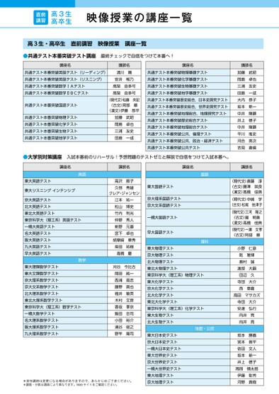 直前講習高3生高卒生映像授業の講座一覧高3生・高卒生直前講習映像授業講座一覧●共通テスト本番突破テスト講座最終チェックで自信をつけて本番へ!講座名共通テスト本番突破英語テスト(リーディング)共通テスト本番突破英語テスト(リスニング)共通テスト本番突破数学ⅠAテスト共通テスト本番突破数学ⅡBCテスト講師名清川舞安井稚乃高梨由多可高梨由多可共通テスト本番突破国語テスト共通テスト本番突破物理テスト共通テスト本番突破化学テスト共通テスト本番突破生物テスト共通テスト本番突破地学テスト(現代文)松藤央記(古文)阿部順(漢文)伊藤恭平加藤武昭岡島卓也三浦友史田島一成講座名共通テスト本番突破物理基礎テスト共通テスト本番突破化学基礎テスト共通テスト本番突破生物基礎テスト共通テスト本番突破地学基礎テスト共通テスト本番突破歴史総合,日本史探究テスト共通テスト本番突破歴史総合,世界史探究テスト共通テスト本番突破地理総合,地理探究テスト共通テスト本番突破歴史総合テスト共通テスト本番突破地理総合テスト共通テスト本番突破公共,倫理テスト共通テスト本番突破公共,政治・経済テスト共通テスト本番突破公共テスト●大学別対策講座入試本番前のリハーサル!予想問題のテストゼミと解説で自信をつけて入試本番へ。講師名加藤武昭岡島卓也三浦友史田島一成大内恭子坂本新一中井隆顕井上徳子中井隆顕平川唯史河合英次吉見直倫講師名講座名英語東大英語テスト東大リスニングインテンシブ京大英語テスト北大英語テスト東北大英語テスト東京科学大(理工系)英語テスト一橋大英語テスト名大英語テスト阪大英語テスト九大英語テスト早大英語テスト数学東大理類数学テスト東大文類数学テスト京大理系数学テスト京大文系数学テスト北大理系数学テスト東北大理系数学テスト東京科学大(理工系)数学テスト一橋大数学テスト名大理系数学テスト阪大理系数学テスト九大理系数学テスト講師名高沢節子久恒秀雄クレア・ジャンセン江本祐一松山博史竹内利光仲野秀人新野元基宮下卓也胡摩﨑章秀柴田祐樹髙橋慶刈谷今比古岡田純一西浦高志藤野真也福井敏英木村文彦香坂季京飯田忠司小田裕介涌谷俊之野竿陽司*担当講師は変更になる場合がありますので、あらかじめご了承ください。*講数・分数は講座により異なります。Webサイトをご確認ください。講座名国語東大国語テスト京大理系国語テスト京大文系国語テスト一橋大国語テスト早大国語テスト理科東大物理テスト京大物理テスト北大物理テスト東北大物理テスト東京科学大(理工系)物理テスト東大化学テスト京大化学テスト北大化学テスト東北大化学テスト東京科学大(理工系)化学テスト東大生物テスト北大生物テスト地歴・公民東大日本史テスト京大日本史テスト一橋大日本史テスト東大世界史テスト京大世界史テスト一橋大世界史テスト東大地理テスト京大地理テスト(現代文)斎藤淳(古文)藤澤咲良(漢文)髙橋佳典(現代文)中崎学(古文)松尾佳津子(現代文)三河隆之(古文)園明美(漢文)髙橋佳典(現代文)一瀬文孝(古文)阿部順小野仁彦乾雅博島村誠渡部大嗣田辺久寺田大介西章嘉高田マサカズ寺田大介安達弘行向井亮向井亮坂本勝義宮本晋平依田文人坂本新一井上徳子髙岡慎太郎伊藤彰芳河野貴樹