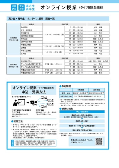 冬期講習直前講習高3生高卒生オンライン授業(ライブ配信型授業)高3生・高卒生オンライン授業講座一覧冬期講習各90分×5講講座名私大英語文法・語法攻略早大現代文GMARCH現代文早大古文GMARCH古文早慶大日本史日本史早慶大世界史世界史直前講習各90分×4講講座名早大国語テストファイナル私大現代文テストファイナル私大古文テスト早慶大日本史テスト早慶大世界史テスト授業日時12/26(木)〜12/30(月)12/20(金)〜12/24(火)1/2(木)〜1/6(月)授業日時1/24(金)・1/25(土)1/29(水)・1/30(木)1/27(月)・1/28(火)9:00〜10:3011:00〜12:3017:20〜18:5019:20〜20:5015:20〜16:5013:20〜14:5015:20〜16:5013:20〜14:5019:20〜20:5017:20〜18:5013:20〜16:4017:00〜20:209:00〜12:2013:20〜16:4013:20〜16:40講師成川博康成川博康木村哲也木村哲也隼坂しのぶ隼坂しのぶ竹内良元竹内良元沼田英之沼田英之講師木村哲也/隼坂しのぶ木村哲也隼坂しのぶ竹内良元沼田英之オンライン授業(ライブ配信型授業)申込・受講方法オンライン授業のイメージ●申込期限冬期講習直前講習新規・追加2025/1/6(月)まで2025/2/6(木)まで変更・取りやめライブ配信の受講開始日の4日前まで※ライブ配信を受講する場合は、ライブ配信の受講開始日の4日前までにお申し込みください。※2025/1/2(木)受講開始の講座は、授業前日までに教材のお届けが間に合うように、2024/12/27(金)までにご入金ください。自宅で受講視聴端末とインターネット環境は、ご自身でご用意ください。●受講の流れ申込・受講方法講座のお申し込みとお支払い他の冬期・直前講習の講座と同様にお申し込みください。教材のお受け取り専用サイトにログインし講義を視聴※見逃し配信で復習もできる※視聴方法は、教材に同封される「オンライン授業の受講方法について」をご確認ください。受講の流れはWebサイトからご確認ください。タブレットやスマートフォン、パソコンなどの機器とインターネット環境をご準備ください。オンライン授業当日は、視聴サイトへアクセスし、ログインしてお待ちください。視聴先のURL・見逃し配信の視聴方法などの詳細は、教材に同封される「オンライン授業の受講方法について」に記載があります。※見逃し配信は「終了した講単位」で視聴可能です。2024年度冬期・直前講習同名講座(対面/映像)と同一内容です。本授業担当講師に、授業当日やWeb質問書で質問いただくことはできません。あらかじめご了承のうえ、お申し込みください。注意事項校舎で実施している授業をライブ配信教室の臨場感を感じながら受講できます。●視聴方法