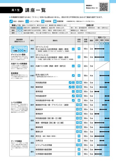 高1生講座一覧講座案内・申込はこちら!▶▶冬期講習を受講するために「テスト」を受ける必要はありません。現在の学力や学習状況にあわせて講座を選択できます。採点・添削ありリスニングあり対対面授業映映像授業*映像授業の申込・受講方法は2ページをご覧ください。講座レベル:講座レベルの目安です。数字が大きいほど、難易度の高い授業を行います。目標大学特別選抜難関標準531642高度な学力(論理的思考力、課題解決力、論述力等)を伸ばします。知識を活用するための応用力、思考力・判断力・表現力を伸ばします。基本知識の理解と、それに基づき考察する力、問題を解く力を伸ばします。東大・京大・医学部医学科・東京科学大・一橋大・旧帝大など難関国公立大・早慶大など国公立大・GMARCH・その他私立大など講座名授業形式授業時間講数講座レベル標準12難関34特別選抜56講座種類(講座のねらい)冬トクキャンペーン1講座円500ダイジェスト講座河合塾の講座を初めて受ける方におすすめです。90分×2講で重要ポイントを習得できます。共通テスト対策講座この冬から共通テスト対策を行い、大学入学共通テストでの高得点をめざして、準備を万全にします。医進講座難関大医学部で要求されるハイレベルな問題で高得点を取るためのポイントを解説します。レベル別講座現役合格に向け、内容を定着させるとともに、現時点の学力をレベルアップさせたい方におすすめの講座です。レベル別に講座が設置されていますので、自身に最適の講座を選ぶことができます。テーマ別講座特定のテーマ・分野について学習します。得意分野の更なる強化や苦手分野の克服など、自身の目的に応じて講座を選ぶことができます。英語英文法-動詞・準動詞・関係詞-国語理科古典文法ビジュアル古文常識物理基礎の徹底理解化学基礎の徹底理解教科英語数学【ダイジェスト】冬から始める入試対策英語(難関・標準)-「関係詞・接続詞」の「わかった!なるほど!」を実感-【ダイジェスト】冬から始める入試対策数学(難関・標準)-「三角比(図形と計量)」の「わかった!なるほど!」を実感-総合共通テスト対策(英語・数学・現代文)小論文医系小論文入門-医学科合格に向けて今がスタート!-特別選抜英語英語難関英語標準英語特別選抜数学特別選抜数学中高一貫数学難関数学中高一貫-アドバンスト(速習)難関数学標準数学特別選抜国語【現2講・古3講】難関・標準国語【現2講・古3講】難関物理難関化学国語理科対対映対対映対映対映対映映対映対映対映対映対映対映対映対対対映対対90分2講90分2講60分3講90分4講90分90分90分90分90分90分90分90分90分90分90分90分90分90分90分90分90分5講5講5講5講5講5講5講5講5講5講5講5講3講5講2講5講5講