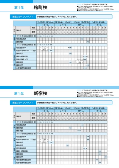 豊富なラインアップ!映像授業の講座一覧は2ページをご覧ください。豊富なラインアップ!映像授業の講座一覧は2ページをご覧ください。高1生麹町校この色のマスが授業のある時限です。●同一名称の講座は設置校舎・設置期間(ターム)・授業時間(時限)が異なっても同一内容です。●担当講師は変更になる場合がありますので、あらかじめご了承ください。●講師のフルネームはWebサイトでご確認ください。12/16(月)~12/18(水)12/20(金)~12/24(火)12/26(木)~12/30(月)1/2(木)~1/6(月)1ターム2ターム3ターム4ターム12345612345612345612345609:00〜10:3010:50〜12:2013:20〜14:5015:10〜16:4017:00〜18:3018:50〜20:2009:00〜10:3010:50〜12:2013:20〜14:5015:10〜16:4017:00〜18:3018:50〜20:2009:00〜10:3010:50〜12:2013:20〜14:5015:10〜16:4017:00〜18:3018:50〜20:2009:00〜10:3010:50〜12:2013:20〜14:5015:10〜16:4017:00〜18:3018:50〜20:20時限時間講座名12/15(日)17:00~20:20栗原12/8(日)17:00~20:20島田12/18は5限のみ島田【ダイジェスト】冬から始める入試対策英語(難関・標準)特別選抜英語難関英語【ダイジェスト】冬から始める入試対策数学(難関・標準)特別選抜数学難関数学中高一貫-アドバンスト(速習)難関数学難関・標準国語医系小論文入門難関物理難関化学化学基礎の徹底理解佐藤押田12/26~29の4日間金子・森田田本鈴木(翔)鈴木(翔)口(哲)横川杉山教科英語数学国語小論文理科高1生新宿校この色のマスが授業のある時限です。●同一名称の講座は設置校舎・設置期間(ターム)・授業時間(時限)が異なっても同一内容です。●担当講師は変更になる場合がありますので、あらかじめご了承ください。●講師のフルネームはWebサイトでご確認ください。12/16(月)~12/18(水)12/20(金)~12/24(火)12/26(木)~12/30(月)1/2(木)~1/6(月)1ターム2ターム3ターム4ターム12345612345612345612345609:00〜10:3010:50〜12:2013:20〜14:5015:10〜16:4017:00〜18:3018:50〜20:2009:00〜10:3010:50〜12:2013:20〜14:5015:10〜16:4017:00〜18:3018:50〜20:2009:00〜10:3010:50〜12:2013:20〜14:5015:10〜16:4017:00〜18:3018:50〜20:2009:00〜10:3010:50〜12:2013:20〜14:5015:10〜16:4017:00〜18:3018:50〜20:20時限時間講座名12/15(日)13:20~16:40高山12/19(木)17:00~20:20永島12/18は5限のみ今田【ダイジェスト】冬から始める入試対策英語(難関・標準)特別選抜英語難関英語標準英語【ダイジェスト】冬から始める入試対策数学(難関・標準)特別選抜数学難関数学中高一貫-アドバンスト(速習)難関数学標準数学特別選抜国語難関・標準国語難関物理難関化学物理基礎の徹底理解化学基礎の徹底理解高山木村(哲)吉川(量)三木成合三河・園永島上野宮原岡島宮原岡島教科英語数学国語理科●2024年度/冬期講習/東日本/麹町/高1生/パターン14452024_57_3_328_31_20240710141135.csv/1ページ校了時削除