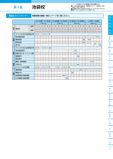 豊富なラインアップ!映像授業の講座一覧は2ページをご覧ください。高1生池袋校この色のマスが授業のある時限です。●同一名称の講座は設置校舎・設置期間(ターム)・授業時間(時限)が異なっても同一内容です。●担当講師は変更になる場合がありますので、あらかじめご了承ください。●講師のフルネームはWebサイトでご確認ください。麹町新宿池袋秋葉原自由が丘吉祥寺調布立川町田厚木藤沢横浜あざみ野金沢文庫大宮南浦和川越柏津田沼千葉水戸12/16(月)~12/18(水)12/20(金)~12/24(火)12/26(木)~12/30(月)1/2(木)~1/6(月)1ターム2ターム3ターム4ターム12345612345612345612345609:00〜10:3011:00〜12:3013:20〜14:5015:20〜16:5017:20〜18:5019:20〜20:5009:00〜10:3011:00〜12:3013:20〜14:5015:20〜16:5017:20〜18:5019:20〜20:5009:00〜10:3011:00〜12:3013:20〜14:5015:20〜16:5017:20〜18:5019:20〜20:5009:00〜10:3011:00〜12:3013:20〜14:5015:20〜16:5017:20〜18:5019:20〜20:50時限時間講座名【ダイジェスト】冬から始める入試対策英語(難関・標準)特別選抜英語難関英語標準英語英文法【ダイジェスト】冬から始める入試対策数学(難関・標準)特別選抜数学難関数学中高一貫-アドバンスト(速習)難関数学標準数学難関・標準国語古典文法ビジュアル古文常識難関物理難関化学物理基礎の徹底理解化学基礎の徹底理解12/14(土)17:20~20:50近藤12/15(日)17:20~20:50中村(隆)古川12/15(日)13:20~16:50隼坂12/15(日)17:20~20:50隼坂岡島中野(喜)岡島木村(智)近藤高山桜井1/2~4の3日間矢作三木中村(隆)中村(隆)福田中野(喜)中林・品田教科英語数学国語理科高1生この色のマスが授業のある時限です。●同一名称の講座は設置校舎・設置期間(ターム)・授業時間(時限)が異なっても同一内容です。●担当講師は変更になる場合がありますので、あらかじめご了承ください。●講師のフルネームはWebサイトでご確認ください。●2024年度/冬期講習/東日本/池袋/高1生/パターン14452024_57_3_314_31_20240710141135.csv/1ページ校了時削除