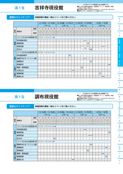 ●同一名称の講座は設置校舎・設置期間(ターム)・授業時間(時限)が異なっても同一内容です。●担当講師は変更になる場合がありますので、あらかじめご了承ください。●講師のフルネームはWebサイトでご確認ください。この色のマスが授業のある時限です。高1生●同一名称の講座は設置校舎・設置期間(ターム)・授業時間(時限)が異なっても同一内容です。●担当講師は変更になる場合がありますので、あらかじめご了承ください。●講師のフルネームはWebサイトでご確認ください。この色のマスが授業のある時限です。高1生麹町新宿池袋秋葉原自由が丘吉祥寺調布立川町田厚木藤沢横浜あざみ野金沢文庫大宮南浦和川越柏津田沼千葉水戸吉祥寺現役館12/16(月)~12/18(水)12/20(金)~12/24(火)12/26(木)~12/30(月)1/2(木)~1/6(月)1ターム2ターム3ターム4ターム12345612345612345612345609:00〜10:3010:50〜12:2013:20〜14:5015:10〜16:4017:00〜18:3018:50〜20:2009:00〜10:3010:50〜12:2013:20〜14:5015:10〜16:4017:00〜18:3018:50〜20:2009:00〜10:3010:50〜12:2013:20〜14:5015:10〜16:4017:00〜18:3018:50〜20:2009:00〜10:3010:50〜12:2013:20〜14:5015:10〜16:4017:00〜18:3018:50〜20:20時限時間講座名12/15(日)17:00~20:20明慶12/16(月)17:00~20:20秋山相川【ダイジェスト】冬から始める入試対策英語(難関・標準)特別選抜英語難関英語標準英語英文法【ダイジェスト】冬から始める入試対策数学(難関・標準)特別選抜数学難関数学中高一貫-アドバンスト(速習)難関数学標準数学難関・標準国語古典文法難関物理難関化学山本中島12/26~28の3日間濱崎流川秋山和田中村内山(洋)高田竹中宇野沢調布現役館12/16(月)~12/18(水)12/20(金)~12/24(火)12/26(木)~12/30(月)1/2(木)~1/6(月)1ターム2ターム3ターム4ターム12345612345612345612345609:00〜10:3010:50〜12:2013:20〜14:5015:10〜16:4017:00〜18:3018:50〜20:2009:00〜10:3010:50〜12:2013:20〜14:5015:10〜16:4017:00〜18:3018:50〜20:2009:00〜10:3010:50〜12:2013:20〜14:5015:10〜16:4017:00〜18:3018:50〜20:2009:00〜10:3010:50〜12:2013:20〜14:5015:10〜16:4017:00〜18:3018:50〜20:20時限時間講座名12/15(日)13:20~16:40吉川(量)岡本12/17(火)17:00~20:20窪田【ダイジェスト】冬から始める入試対策英語(難関・標準)特別選抜英語難関英語標準英語英文法【ダイジェスト】冬から始める入試対策数学(難関・標準)難関数学中高一貫-アドバンスト(速習)難関数学標準数学難関・標準国語難関物理難関化学中園内山(洋)高田窪田松野佐藤宇都税田安東教科英語数学国語理科教科英語数学国語理科●2024年度/冬期講習/東日本/吉祥寺/高1生/パターン14452024_57_3_340_31_20240710141135.csv/1ページ校了時削除