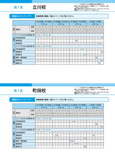 ●同一名称の講座は設置校舎・設置期間(ターム)・授業時間(時限)が異なっても同一内容です。●担当講師は変更になる場合がありますので、あらかじめご了承ください。●講師のフルネームはWebサイトでご確認ください。この色のマスが授業のある時限です。高1生●同一名称の講座は設置校舎・設置期間(ターム)・授業時間(時限)が異なっても同一内容です。●担当講師は変更になる場合がありますので、あらかじめご了承ください。●講師のフルネームはWebサイトでご確認ください。この色のマスが授業のある時限です。高1生立川校12/16(月)~12/18(水)12/20(金)~12/24(火)12/26(木)~12/30(月)1/2(木)~1/6(月)1ターム2ターム3ターム4ターム12345612345612345612345609:00〜10:3010:50〜12:2013:20〜14:5015:10〜16:4017:00〜18:3018:50〜20:2009:00〜10:3010:50〜12:2013:20〜14:5015:10〜16:4017:00〜18:3018:50〜20:2009:00〜10:3010:50〜12:2013:20〜14:5015:10〜16:4017:00〜18:3018:50〜20:2009:00〜10:3010:50〜12:2013:20〜14:5015:10〜16:4017:00〜18:3018:50〜20:20時限時間講座名12/17(火)17:00~20:20東内12/19(木)17:00~20:20横川【ダイジェスト】冬から始める入試対策英語(難関・標準)特別選抜英語難関英語標準英語【ダイジェスト】冬から始める入試対策数学(難関・標準)特別選抜数学難関数学標準数学難関・標準国語難関物理難関化学東内相川古谷中園中園横川和田長谷川小竹町田校12/16(月)~12/18(水)12/20(金)~12/24(火)12/26(木)~12/30(月)1/2(木)~1/6(月)1ターム2ターム3ターム4ターム12345612345612345612345609:00〜10:3010:50〜12:2013:20〜14:5015:10〜16:4017:00〜18:3018:50〜20:2009:00〜10:3010:50〜12:2013:20〜14:5015:10〜16:4017:00〜18:3018:50〜20:2009:00〜10:3010:50〜12:2013:20〜14:5015:10〜16:4017:00〜18:3018:50〜20:2009:00〜10:3010:50〜12:2013:20〜14:5015:10〜16:4017:00〜18:3018:50〜20:20時限時間講座名【ダイジェスト】冬から始める入試対策英語(難関・標準)特別選抜英語難関英語標準英語【ダイジェスト】冬から始める入試対策数学(難関・標準)特別選抜数学難関数学標準数学難関・標準国語難関物理難関化学12/15(日)17:00~20:20近藤中島12/15(日)13:20~16:40隣堺12/18は5限のみ近藤栗原栗原秋山中林・酒井(完)佐々木(哲)板谷安達教科英語数学国語理科教科英語数学国語理科●2024年度/冬期講習/東日本/立川/高1生/パターン14452024_57_3_315_31_20240710141135.csv/1ページ校了時削除