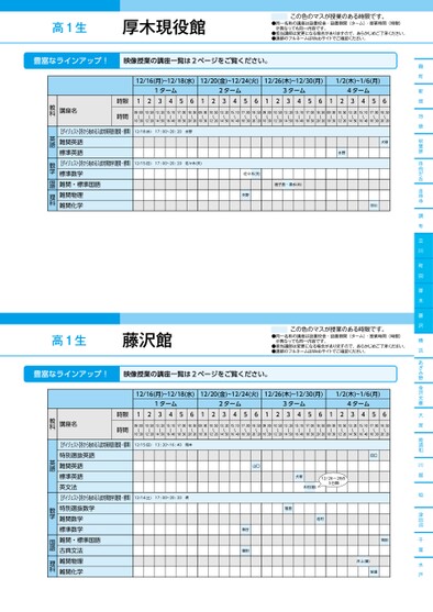 ●同一名称の講座は設置校舎・設置期間(ターム)・授業時間(時限)が異なっても同一内容です。●担当講師は変更になる場合がありますので、あらかじめご了承ください。●講師のフルネームはWebサイトでご確認ください。この色のマスが授業のある時限です。高1生●同一名称の講座は設置校舎・設置期間(ターム)・授業時間(時限)が異なっても同一内容です。●担当講師は変更になる場合がありますので、あらかじめご了承ください。●講師のフルネームはWebサイトでご確認ください。この色のマスが授業のある時限です。高1生麹町新宿池袋秋葉原自由が丘吉祥寺調布立川町田厚木藤沢横浜あざみ野金沢文庫大宮南浦和川越柏津田沼千葉水戸厚木現役館12/16(月)~12/18(水)12/20(金)~12/24(火)12/26(木)~12/30(月)1/2(木)~1/6(月)1ターム2ターム3ターム4ターム12345612345612345612345609:00〜10:3010:50〜12:2013:20〜14:5015:10〜16:4017:00〜18:3018:50〜20:2009:00〜10:3010:50〜12:2013:20〜14:5015:10〜16:4017:00〜18:3018:50〜20:2009:00〜10:3010:50〜12:2013:20〜14:5015:10〜16:4017:00〜18:3018:50〜20:2009:00〜10:3010:50〜12:2013:20〜14:5015:10〜16:4017:00〜18:3018:50〜20:20時限時間講座名12/18(水)17:00~20:20水野12/15(日)17:00~20:20佐々木(夫)【ダイジェスト】冬から始める入試対策英語(難関・標準)難関英語標準英語【ダイジェスト】冬から始める入試対策数学(難関・標準)標準数学難関・標準国語難関物理難関化学佐々木(夫)矢野鹿子島・清水(め)犬塚水野早川藤沢館12/16(月)~12/18(水)12/20(金)~12/24(火)12/26(木)~12/30(月)1/2(木)~1/6(月)1ターム2ターム3ターム4ターム12345612345612345612345609:00〜10:3010:50〜12:2013:20〜14:5015:10〜16:4017:00〜18:3018:50〜20:2009:00〜10:3010:50〜12:2013:20〜14:5015:10〜16:4017:00〜18:3018:50〜20:2009:00〜10:3010:50〜12:2013:20〜14:5015:10〜16:4017:00〜18:3018:50〜20:2009:00〜10:3010:50〜12:2013:20〜14:5015:10〜16:4017:00〜18:3018:50〜20:20時限時間講座名12/15(日)13:20~16:40岡本12/14(土)17:00~20:20堺【ダイジェスト】冬から始める入試対策英語(難関・標準)特別選抜英語難関英語標準英語英文法【ダイジェスト】冬から始める入試対策数学(難関・標準)特別選抜数学難関数学標準数学難関・標準国語古典文法難関物理難関化学犬塚木村(智)12/26~28の3日間福島岩村山口板谷福田田口税田井上(順)安達教科英語数学国語理科教科英語数学国語理科●2024年度/冬期講習/東日本/厚木/高1生/パターン14452024_57_3_332_31_20240710141135.csv/1ページ校了時削除