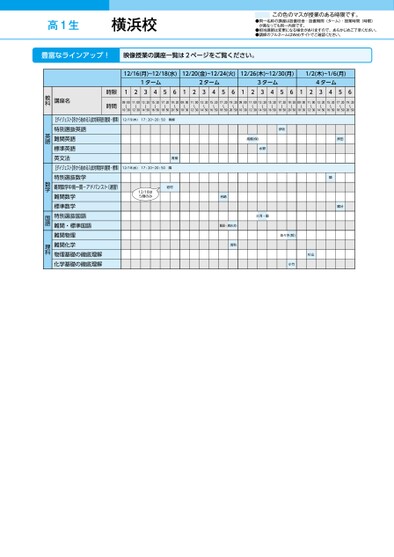 豊富なラインアップ!映像授業の講座一覧は2ページをご覧ください。高1生横浜校この色のマスが授業のある時限です。●同一名称の講座は設置校舎・設置期間(ターム)・授業時間(時限)が異なっても同一内容です。●担当講師は変更になる場合がありますので、あらかじめご了承ください。●講師のフルネームはWebサイトでご確認ください。12/16(月)~12/18(水)12/20(金)~12/24(火)12/26(木)~12/30(月)1/2(木)~1/6(月)1ターム2ターム3ターム4ターム12345612345612345612345609:00〜10:3011:00〜12:3013:20〜14:5015:20〜16:5017:20〜18:5019:20〜20:5009:00〜10:3011:00〜12:3013:20〜14:5015:20〜16:5017:20〜18:5019:20〜20:5009:00〜10:3011:00〜12:3013:20〜14:5015:20〜16:5017:20〜18:5019:20〜20:5009:00〜10:3011:00〜12:3013:20〜14:5015:20〜16:5017:20〜18:5019:20〜20:50時限時間講座名12/19(木)17:20~20:50青柳青柳12/18(水)17:20~20:50隣岩村12/18は5限のみ【ダイジェスト】冬から始める入試対策英語(難関・標準)特別選抜英語難関英語標準英語英文法【ダイジェスト】冬から始める入試対策数学(難関・標準)特別選抜数学難関数学中高一貫-アドバンスト(速習)難関数学標準数学特別選抜国語難関・標準国語難関物理難関化学物理基礎の徹底理解化学基礎の徹底理解押田國分隣伊吹髙橋(保)水野吉崎飯田・清水(め)浅利三河・園佐々木(哲)杉山小竹教科英語数学国語理科高1生この色のマスが授業のある時限です。●同一名称の講座は設置校舎・設置期間(ターム)・授業時間(時限)が異なっても同一内容です。●担当講師は変更になる場合がありますので、あらかじめご了承ください。●講師のフルネームはWebサイトでご確認ください。●2024年度/冬期講習/東日本/横浜/高1生/パターン14452024_57_3_321_31_20240710141135.csv/1ページ校了時削除