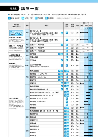 高2生講座一覧▶冬期講習を受講するために「テスト」を受ける必要はありません。現在の学力や学習状況にあわせて講座を選択できます。採点・添削ありリスニングあり対対面授業映映像授業*映像授業の申込・受講方法は17ページをご覧ください。講座名授業形式授業時間講数講座レベル標準12難関34特別選抜56教科英語数学英語数学国語英語数学講座種類(講座のねらい)冬トクキャンペーン1講座円500ダイジェスト講座河合塾の講座を初めて受ける方におすすめです。90分×2講で重要ポイントを習得できます。共通テスト対策講座この冬から共通テスト対策を行い、大学入学共通テストでの高得点をめざして、準備を万全にします。大学別対策講座各大学の出題傾向を徹底分析したテキストを用いて、今後の学習の指針とポイントを提示します。医進講座難関大医学部で要求されるハイレベルな問題で高得点を取るためのポイントを解説します。レベル別講座現役合格に向け、内容を定着させるとともに、現時点の学力をレベルアップさせたい方におすすめの講座です。レベル別に講座が設置されていますので、自身に最適の講座を選ぶことができます。【ダイジェスト】冬から始める入試対策英語(難関・標準)-「関係詞・接続詞」の重要ポイントを伝授!-【ダイジェスト】冬から始める入試対策数学(難関・標準)-「微分法」の重要ポイントを伝授!-共通テスト対策英語共通テスト対策数学共通テスト対策現代文東大英語早慶大英語東大数学小論文医系小論文入門-医学科合格に向けて今がスタート!-特別選抜英語難関英語-トップレベル難関英語-ハイレベル難関英語標準英語特別選抜数学特別選抜理系数学中高一貫難関理系数学中高一貫-アドバンスト(速習)難関数学中高一貫-アドバンスト難関数学-トップレベル難関数学-ハイレベル難関数学標準数学特別選抜国語【現2講・古2講・漢1講】難関現代文難関古文標準現代文標準古文特別選抜物理特別選抜化学難関物理難関化学英語数学国語理科対対映映映対対対対対映対対映対映対映映対映対映対対映対映対映対映対映対映対映対映対映対映対映90分2講90分2講90分90分90分90分90分90分2講2講2講2講2講2講90分4講90分90分90分90分90分90分90分90分90分90分90分90分90分90分90分90分90分90分90分90分90分90分5講5講5講5講5講5講5講5講5講5講5講5講5講5講5講5講5講5講5講5講5講5講