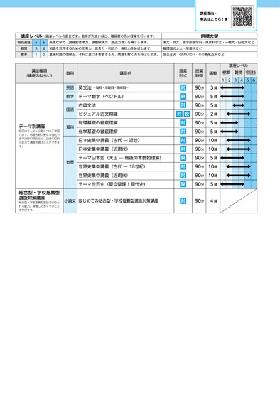 講座レベル:講座レベルの目安です。数字が大きいほど、難易度の高い授業を行います。目標大学特別選抜難関標準531642高度な学力(論理的思考力、課題解決力、論述力等)を伸ばします。知識を活用するための応用力、思考力・判断力・表現力を伸ばします。基本知識の理解と、それに基づき考察する力、問題を解く力を伸ばします。東大・京大・医学部医学科・東京科学大・一橋大・旧帝大など難関国公立大・早慶大など国公立大・GMARCH・その他私立大など講座案内・申込はこちら!▶講座レベル標準12難関34特別選抜56講座種類(講座のねらい)テーマ別講座特定のテーマ・分野について学習します。得意分野の更なる強化や苦手分野の克服など、自身の目的に応じて講座を選ぶことができます。総合型・学校推薦型選抜対策講座総合型・学校推薦型選抜で求められる能力、準備しておくべきことを学びます。教科英語数学国語理科地歴講座名英文法-動詞・準動詞・関係詞-テーマ数学(ベクトル)古典文法ビジュアル古文常識物理基礎の徹底理解化学基礎の徹底理解日本史集中講義(古代―近世)日本史集中講義(近現代)テーマ日本史(大正—戦後の本質的理解)世界史集中講義(古代―18世紀)世界史集中講義(近現代)テーマ世界史(要点整理!現代史)小論文はじめての総合型・学校推薦型選抜対策講座授業形式対映対対映対対対対映対対映対授業時間90分90分90分90分90分90分90分90分90分90分90分90分講数3講5講5講2講5講5講10講10講5講10講10講5講90分4講