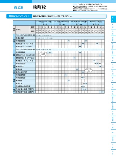 豊富なラインアップ!映像授業の講座一覧は17ページをご覧ください。高2生麹町校この色のマスが授業のある時限です。●同一名称の講座は設置校舎・設置期間(ターム)・授業時間(時限)が異なっても同一内容です。●担当講師は変更になる場合がありますので、あらかじめご了承ください。●講師のフルネームはWebサイトでご確認ください。麹町新宿池袋秋葉原自由が丘吉祥寺調布立川町田厚木藤沢横浜あざみ野金沢文庫大宮南浦和川越柏津田沼千葉水戸12/16(月)~12/18(水)12/20(金)~12/24(火)12/26(木)~12/30(月)1/2(木)~1/6(月)1ターム2ターム3ターム4ターム12345612345612345612345609:00〜10:3010:50〜12:2013:20〜14:5015:10〜16:4017:00〜18:3018:50〜20:2009:00〜10:3010:50〜12:2013:20〜14:5015:10〜16:4017:00〜18:3018:50〜20:2009:00〜10:3010:50〜12:2013:20〜14:5015:10〜16:4017:00〜18:3018:50〜20:2009:00〜10:3010:50〜12:2013:20〜14:5015:10〜16:4017:00〜18:3018:50〜20:20時限時間講座名12/15(日)17:00~20:20新野12/8(日)13:20~16:40木村(智)12/8(日)17:00~20:20竹内郷田12/18は5限のみ【ダイジェスト】冬から始める入試対策英語(難関・標準)早慶大英語特別選抜英語難関英語-トップレベル難関英語-ハイレベル【ダイジェスト】冬から始める入試対策数学(難関・標準)特別選抜数学難関理系数学中高一貫-アドバンスト(速習)難関数学中高一貫-アドバンスト難関数学-トップレベル特別選抜国語難関現代文難関古文医系小論文入門特別選抜物理特別選抜化学難関物理難関化学化学基礎の徹底理解日本史集中講義(近現代)世界史集中講義(近現代)押田佐藤押田新野是枝広瀬成合杉山杉山小野木12/26~29の4日間田本向井(勇)鈴木(翔)鈴木(翔)坂本(勝)竹内竹内川野・園・豊崎川野加藤教科英語数学国語小論文理科地歴●2024年度/冬期講習/東日本/麹町/高2生/パターン14452024_57_3_328_32_20240710141203.csv/1ページ校了時削除