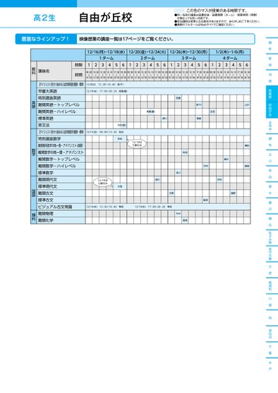 ●同一名称の講座は設置校舎・設置期間(ターム)・授業時間(時限)が異なっても同一内容です。●担当講師は変更になる場合がありますので、あらかじめご了承ください。●講師のフルネームはWebサイトでご確認ください。この色のマスが授業のある時限です。高2生麹町新宿池袋秋葉原自由が丘吉祥寺調布立川町田厚木藤沢横浜あざみ野金沢文庫大宮南浦和川越柏津田沼千葉水戸12/16(月)~12/18(水)12/20(金)~12/24(火)12/26(木)~12/30(月)1/2(木)~1/6(月)1ターム2ターム3ターム4ターム12345612345612345612345609:00〜10:3010:50〜12:2013:20〜14:5015:10〜16:4017:00〜18:3018:50〜20:2009:00〜10:3010:50〜12:2013:20〜14:5015:10〜16:4017:00〜18:3018:50〜20:2009:00〜10:3010:50〜12:2013:20〜14:5015:10〜16:4017:00〜18:3018:50〜20:2009:00〜10:3010:50〜12:2013:20〜14:5015:10〜16:4017:00〜18:3018:50〜20:2012/8(日)13:20~16:40森(千)12/18(水)17:00~20:20髙橋(慶)木村(智)12/15(日)09:00~12:20松田生田12/18は5限のみ12/18は5限のみ大窪佐藤髙橋(慶)清川森(千)尾崎吉田松田流川絵川大野國分木村越野竹内脇坂山中横田堀尾12/19(木)13:20~16:40隼坂12/19(木)17:00~20:20隼坂竹中西尾時限時間講座名教科【ダイジェスト】冬から始める入試対策英語(難関・標準)早慶大英語特別選抜英語難関英語-トップレベル難関英語-ハイレベル標準英語英文法【ダイジェスト】冬から始める入試対策数学(難関・標準)特別選抜数学難関理系数学中高一貫-アドバンスト(速習)難関数学中高一貫-アドバンスト難関数学-トップレベル難関数学-ハイレベル標準数学難関現代文標準現代文難関古文標準古文ビジュアル古文常識難関物理難関化学英語数学国語理科自由が丘校●2024年度/冬期講習/東日本/自由が丘/高2生/パターン14452024_57_3_337_32_20240710185311.csv/1ページ校了時削除