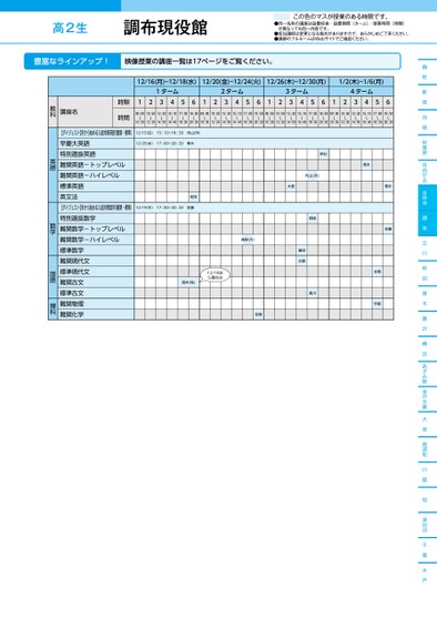 ●同一名称の講座は設置校舎・設置期間(ターム)・授業時間(時限)が異なっても同一内容です。●担当講師は変更になる場合がありますので、あらかじめご了承ください。●講師のフルネームはWebサイトでご確認ください。この色のマスが授業のある時限です。高2生麹町新宿池袋秋葉原自由が丘吉祥寺調布立川町田厚木藤沢横浜あざみ野金沢文庫大宮南浦和川越柏津田沼千葉水戸12/16(月)~12/18(水)12/20(金)~12/24(火)12/26(木)~12/30(月)1/2(木)~1/6(月)1ターム2ターム3ターム4ターム12345612345612345612345609:00〜10:3010:50〜12:2013:20〜14:5015:10〜16:4017:00〜18:3018:50〜20:2009:00〜10:3010:50〜12:2013:20〜14:5015:10〜16:4017:00〜18:3018:50〜20:2009:00〜10:3010:50〜12:2013:20〜14:5015:10〜16:4017:00〜18:3018:50〜20:2009:00〜10:3010:50〜12:2013:20〜14:5015:10〜16:4017:00〜18:3018:50〜20:2012/15(日)15:10~18:30内山(洋)12/25(水)17:00~20:20青木岡本12/19(木)17:00~20:20佐藤村青木内山(洋)内山(洋)大島窪田川野岡田貴川12/18は5限のみ酒井(完)高梨(大)安東青木佐藤本間宇都時限時間講座名教科【ダイジェスト】冬から始める入試対策英語(難関・標準)早慶大英語特別選抜英語難関英語-トップレベル難関英語-ハイレベル標準英語英文法【ダイジェスト】冬から始める入試対策数学(難関・標準)特別選抜数学難関数学-トップレベル難関数学-ハイレベル標準数学難関現代文標準現代文難関古文標準古文難関物理難関化学英語数学国語理科調布現役館●2024年度/冬期講習/東日本/調布/高2生/パターン14452024_57_3_367_32_20240710190600.csv/1ページ校了時削除