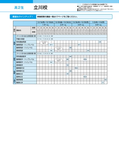 ●同一名称の講座は設置校舎・設置期間(ターム)・授業時間(時限)が異なっても同一内容です。●担当講師は変更になる場合がありますので、あらかじめご了承ください。●講師のフルネームはWebサイトでご確認ください。この色のマスが授業のある時限です。高2生12/16(月)~12/18(水)12/20(金)~12/24(火)12/26(木)~12/30(月)1/2(木)~1/6(月)1ターム2ターム3ターム4ターム12345612345612345612345609:00〜10:3010:50〜12:2013:20〜14:5015:10〜16:4017:00〜18:3018:50〜20:2009:00〜10:3010:50〜12:2013:20〜14:5015:10〜16:4017:00〜18:3018:50〜20:2009:00〜10:3010:50〜12:2013:20〜14:5015:10〜16:4017:00〜18:3018:50〜20:2009:00〜10:3010:50〜12:2013:20〜14:5015:10〜16:4017:00〜18:3018:50〜20:2012/16(月)17:00~20:20仲野12/17(火)17:00~20:20仲野12/18は5限のみ森(千)幸長12/18は5限のみ12/15(日)17:00~20:20柳沢12/18は5限のみ柳沢森(千)小森仲野長野松藤長野今田大野伊藤(武)日髙伊東(敦)酒井(完)長谷川小竹時限時間講座名教科【ダイジェスト】冬から始める入試対策英語(難関・標準)早慶大英語特別選抜英語難関英語-トップレベル難関英語-ハイレベル標準英語【ダイジェスト】冬から始める入試対策数学(難関・標準)特別選抜数学難関数学-トップレベル難関数学-ハイレベル標準数学難関現代文標準現代文難関古文標準古文難関物理難関化学英語数学国語理科立川校●2024年度/冬期講習/東日本/立川/高2生/パターン14452024_57_3_315_32_20240710141203.csv/1ページ校了時削除