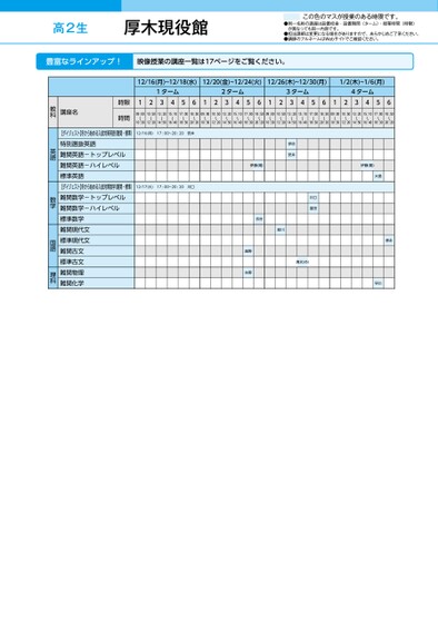 ●同一名称の講座は設置校舎・設置期間(ターム)・授業時間(時限)が異なっても同一内容です。●担当講師は変更になる場合がありますので、あらかじめご了承ください。●講師のフルネームはWebサイトでご確認ください。この色のマスが授業のある時限です。高2生12/16(月)~12/18(水)12/20(金)~12/24(火)12/26(木)~12/30(月)1/2(木)~1/6(月)1ターム2ターム3ターム4ターム12345612345612345612345609:00〜10:3010:50〜12:2013:20〜14:5015:10〜16:4017:00〜18:3018:50〜20:2009:00〜10:3010:50〜12:2013:20〜14:5015:10〜16:4017:00〜18:3018:50〜20:2009:00〜10:3010:50〜12:2013:20〜14:5015:10〜16:4017:00〜18:3018:50〜20:2009:00〜10:3010:50〜12:2013:20〜14:5015:10〜16:4017:00〜18:3018:50〜20:20時限時間講座名12/16(月)17:00~20:20安井12/17(火)17:00~20:20川口【ダイジェスト】冬から始める入試対策英語(難関・標準)特別選抜英語難関英語-トップレベル難関英語-ハイレベル標準英語【ダイジェスト】冬から始める入試対策数学(難関・標準)難関数学-トップレベル難関数学-ハイレベル標準数学難関現代文標準現代文難関古文標準古文難関物理難関化学伊吹安井伊藤(剛)川口富田清水(め)古谷絵川越野矢野伊藤(剛)大島森永早川教科英語数学国語理科厚木現役館●2024年度/冬期講習/東日本/厚木/高2生/パターン14452024_57_3_332_32_20240710141203.csv/1ページ校了時削除