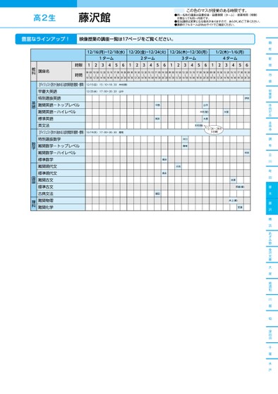 ●同一名称の講座は設置校舎・設置期間(ターム)・授業時間(時限)が異なっても同一内容です。●担当講師は変更になる場合がありますので、あらかじめご了承ください。●講師のフルネームはWebサイトでご確認ください。この色のマスが授業のある時限です。高2生麹町新宿池袋秋葉原自由が丘吉祥寺調布立川町田厚木藤沢横浜あざみ野金沢文庫大宮南浦和川越柏津田沼千葉水戸12/16(月)~12/18(水)12/20(金)~12/24(火)12/26(木)~12/30(月)1/2(木)~1/6(月)1ターム2ターム3ターム4ターム12345612345612345612345609:00〜10:3010:50〜12:2013:20〜14:5015:10〜16:4017:00〜18:3018:50〜20:2009:00〜10:3010:50〜12:2013:20〜14:5015:10〜16:4017:00〜18:3018:50〜20:2009:00〜10:3010:50〜12:2013:20〜14:5015:10〜16:4017:00〜18:3018:50〜20:2009:00〜10:3010:50〜12:2013:20〜14:5015:10〜16:4017:00〜18:3018:50〜20:2012/15(日)15:10~18:30木村(智)12/25(水)17:00~20:20山中12/19(木)17:00~20:20堀尾山中木村(智)大島大胡木村(智)12/26~28の3日間中島岡本福田川口堀尾板谷森永小池伊吹村本吉澤阿部(順)井上(順)安達時限時間講座名教科【ダイジェスト】冬から始める入試対策英語(難関・標準)早慶大英語特別選抜英語難関英語-トップレベル難関英語-ハイレベル標準英語英文法【ダイジェスト】冬から始める入試対策数学(難関・標準)特別選抜数学難関数学-トップレベル難関数学-ハイレベル標準数学難関現代文標準現代文難関古文標準古文古典文法難関物理難関化学英語数学国語理科藤沢館●2024年度/冬期講習/東日本/藤沢/高2生/パターン14452024_57_3_331_32_20240710141203.csv/1ページ校了時削除