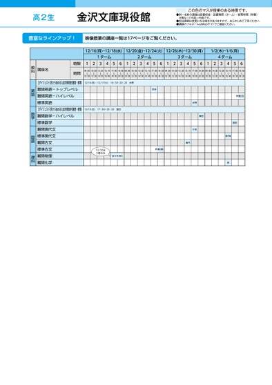 ●同一名称の講座は設置校舎・設置期間(ターム)・授業時間(時限)が異なっても同一内容です。●担当講師は変更になる場合がありますので、あらかじめご了承ください。●講師のフルネームはWebサイトでご確認ください。この色のマスが授業のある時限です。高2生12/16(月)~12/18(水)12/20(金)~12/24(火)12/26(木)~12/30(月)1/2(木)~1/6(月)1ターム2ターム3ターム4ターム12345612345612345612345609:00〜10:3010:50〜12:2013:20〜14:5015:10〜16:4017:00〜18:3018:50〜20:2009:00〜10:3010:50〜12:2013:20〜14:5015:10〜16:4017:00〜18:3018:50〜20:2009:00〜10:3010:50〜12:2013:20〜14:5015:10〜16:4017:00〜18:3018:50〜20:2009:00〜10:3010:50〜12:2013:20〜14:5015:10〜16:4017:00〜18:3018:50〜20:20時限時間講座名【ダイジェスト】冬から始める入試対策英語(難関・標準)難関英語-トップレベル難関英語-ハイレベル標準英語【ダイジェスト】冬から始める入試対策数学(難関・標準)難関数学-ハイレベル標準数学難関現代文標準現代文難関古文標準古文難関物理難関化学12/16(月)・12/17(火)18:50~20:20水野安井12/15(日)17:00~20:20富田12/18は5限のみ佐々木(哲)鹿内阿部(順)水野小池横田伊藤(宏)富田鹿子島原教科英語数学国語理科金沢文庫現役館●2024年度/冬期講習/東日本/金沢文庫/高2生/パターン14452024_57_3_335_32_20240710141203.csv/1ページ校了時削除