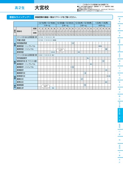 ●同一名称の講座は設置校舎・設置期間(ターム)・授業時間(時限)が異なっても同一内容です。●担当講師は変更になる場合がありますので、あらかじめご了承ください。●講師のフルネームはWebサイトでご確認ください。この色のマスが授業のある時限です。高2生麹町新宿池袋秋葉原自由が丘吉祥寺調布立川町田厚木藤沢横浜あざみ野金沢文庫大宮南浦和川越柏津田沼千葉水戸12/16(月)~12/18(水)12/20(金)~12/24(火)12/26(木)~12/30(月)1/2(木)~1/6(月)1ターム2ターム3ターム4ターム12345612345612345612345609:00〜10:3010:50〜12:2013:20〜14:5015:10〜16:4017:00〜18:3018:50〜20:2009:00〜10:3010:50〜12:2013:20〜14:5015:10〜16:4017:00〜18:3018:50〜20:2009:00〜10:3010:50〜12:2013:20〜14:5015:10〜16:4017:00〜18:3018:50〜20:2009:00〜10:3010:50〜12:2013:20〜14:5015:10〜16:4017:00〜18:3018:50〜20:2012/15(日)17:00~20:20川原12/19(木)17:00~20:20髙橋(慶)久恒12/18は5限のみ田村(修)幸長12/8(日)17:00~20:20渡辺髙橋(慶)明慶亀山渡辺大澤中村(隆)佐河一瀬宇都永島清水(直)脇坂12/18は5限のみ岡島時限時間講座名教科【ダイジェスト】冬から始める入試対策英語(難関・標準)早慶大英語特別選抜英語難関英語-トップレベル難関英語-ハイレベル標準英語【ダイジェスト】冬から始める入試対策数学(難関・標準)特別選抜数学難関理系数学中高一貫-アドバンスト(速習)難関数学-トップレベル難関数学-ハイレベル標準数学難関現代文標準現代文難関古文標準古文難関物理難関化学英語数学国語理科大宮校●2024年度/冬期講習/東日本/大宮/高2生/パターン14452024_57_3_324_32_20240710184428.csv/1ページ校了時削除