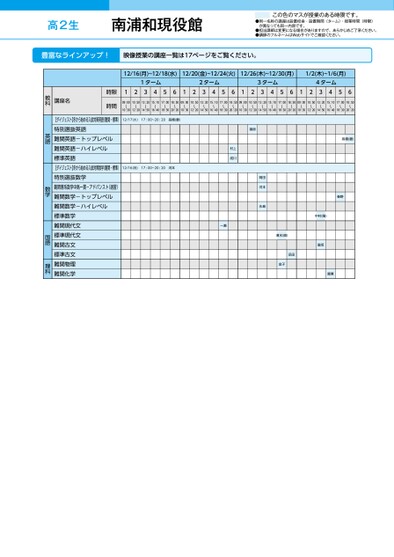 ●同一名称の講座は設置校舎・設置期間(ターム)・授業時間(時限)が異なっても同一内容です。●担当講師は変更になる場合がありますので、あらかじめご了承ください。●講師のフルネームはWebサイトでご確認ください。この色のマスが授業のある時限です。高2生12/16(月)~12/18(水)12/20(金)~12/24(火)12/26(木)~12/30(月)1/2(木)~1/6(月)1ターム2ターム3ターム4ターム12345612345612345612345609:00〜10:3010:50〜12:2013:20〜14:5015:10〜16:4017:00〜18:3018:50〜20:2009:00〜10:3010:50〜12:2013:20〜14:5015:10〜16:4017:00〜18:3018:50〜20:2009:00〜10:3010:50〜12:2013:20〜14:5015:10〜16:4017:00〜18:3018:50〜20:2009:00〜10:3010:50〜12:2013:20〜14:5015:10〜16:4017:00〜18:3018:50〜20:20時限時間講座名12/17(火)17:00~20:20髙橋(慶)12/16(月)17:00~20:20河本【ダイジェスト】冬から始める入試対策英語(難関・標準)特別選抜英語難関英語-トップレベル難関英語-ハイレベル標準英語【ダイジェスト】冬から始める入試対策数学(難関・標準)特別選抜数学難関理系数学中高一貫-アドバンスト(速習)難関数学-トップレベル難関数学-ハイレベル標準数学難関現代文標準現代文難関古文標準古文難関物理難関化学篠原村上成川岡田河本永島一瀬髙橋(慶)秦野清水(直)品田金子中村(隆)脇坂國兼教科英語数学国語理科南浦和現役館●2024年度/冬期講習/東日本/南浦和/高2生/パターン14452024_57_3_336_32_20240710141203.csv/1ページ校了時削除