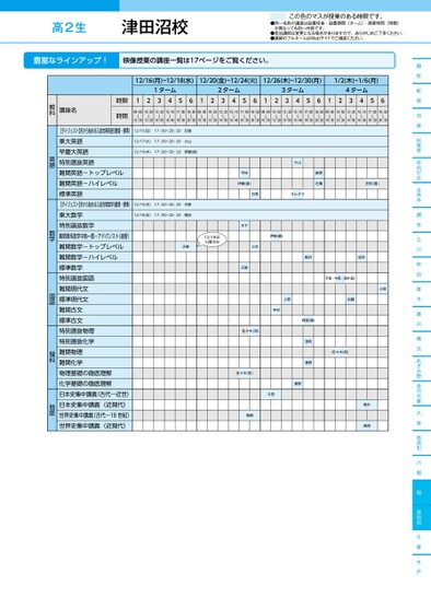 ●同一名称の講座は設置校舎・設置期間(ターム)・授業時間(時限)が異なっても同一内容です。●担当講師は変更になる場合がありますので、あらかじめご了承ください。●講師のフルネームはWebサイトでご確認ください。この色のマスが授業のある時限です。高2生麹町新宿池袋秋葉原自由が丘吉祥寺調布立川町田厚木藤沢横浜あざみ野金沢文庫大宮南浦和川越柏津田沼千葉水戸12/16(月)~12/18(水)12/20(金)~12/24(火)12/26(木)~12/30(月)1/2(木)~1/6(月)1ターム2ターム3ターム4ターム12345612345612345612345609:00〜10:3010:50〜12:2013:20〜14:5015:10〜16:4017:00〜18:3018:50〜20:2009:00〜10:3010:50〜12:2013:20〜14:5015:10〜16:4017:00〜18:3018:50〜20:2009:00〜10:3010:50〜12:2013:20〜14:5015:10〜16:4017:00〜18:3018:50〜20:2009:00〜10:3010:50〜12:2013:20〜14:5015:10〜16:4017:00〜18:3018:50〜20:2012/15(日)17:00~20:20石橋12/17(火)17:00~20:20小山12/19(木)17:00~20:20伊藤(直)12/19(木)17:00~20:20天野12/18(水)17:00~20:20岡田12/18は5限のみ天野平林伊藤(直)木下天野小山新野石橋田村(喜)日髙えんどう伊東(鋼)三木柳沢成合手塚・中西・酒井(辰)小宮松藤阿部(順)浅利清野佐々木(哲)高杉髙岡上野中村佐々木(哲)佐々木哲)清野太田佐々木(哲)島崎時限時間講座名教科【ダイジェスト】冬から始める入試対策英語(難関・標準)東大英語早慶大英語特別選抜英語難関英語-トップレベル難関英語-ハイレベル標準英語【ダイジェスト】冬から始める入試対策数学(難関・標準)東大数学特別選抜数学難関理系数学中高一貫-アドバンスト(速習)難関数学-トップレベル難関数学-ハイレベル標準数学特別選抜国語難関現代文標準現代文難関古文標準古文特別選抜物理特別選抜化学難関物理難関化学物理基礎の徹底理解化学基礎の徹底理解日本史集中講義(古代―近世)日本史集中講義(近現代)世界史集中講義(古代―18世紀)世界史集中講義(近現代)英語数学国語理科地歴津田沼校●2024年度/冬期講習/東日本/津田沼/高2生/パターン14452024_57_3_327_32_20240710141203.csv/1ページ校了時削除