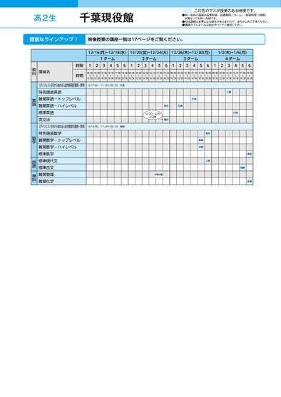 ●同一名称の講座は設置校舎・設置期間(ターム)・授業時間(時限)が異なっても同一内容です。●担当講師は変更になる場合がありますので、あらかじめご了承ください。●講師のフルネームはWebサイトでご確認ください。この色のマスが授業のある時限です。高2生12/16(月)~12/18(水)12/20(金)~12/24(火)12/26(木)~12/30(月)1/2(木)~1/6(月)1ターム2ターム3ターム4ターム12345612345612345612345609:00〜10:3010:50〜12:2013:20〜14:5015:10〜16:4017:00〜18:3018:50〜20:2009:00〜10:3010:50〜12:2013:20〜14:5015:10〜16:4017:00〜18:3018:50〜20:2009:00〜10:3010:50〜12:2013:20〜14:5015:10〜16:4017:00〜18:3018:50〜20:2009:00〜10:3010:50〜12:2013:20〜14:5015:10〜16:4017:00〜18:3018:50〜20:2012/17(火)17:00~20:20日髙12/16(月)17:00~20:20飯島平林是枝石橋12/20~22の3日間藤田久野日髙飯島天野福永上野岡野島田安東中野(健)中野(健)時限時間講座名教科【ダイジェスト】冬から始める入試対策英語(難関・標準)特別選抜英語難関英語-トップレベル難関英語-ハイレベル標準英語英文法【ダイジェスト】冬から始める入試対策数学(難関・標準)特別選抜数学難関数学-トップレベル難関数学-ハイレベル標準数学標準現代文標準古文難関物理難関化学英語数学国語理科千葉現役館●2024年度/冬期講習/東日本/千葉/高2生/パターン14452024_57_3_334_32_20240710185229.csv/1ページ校了時削除
