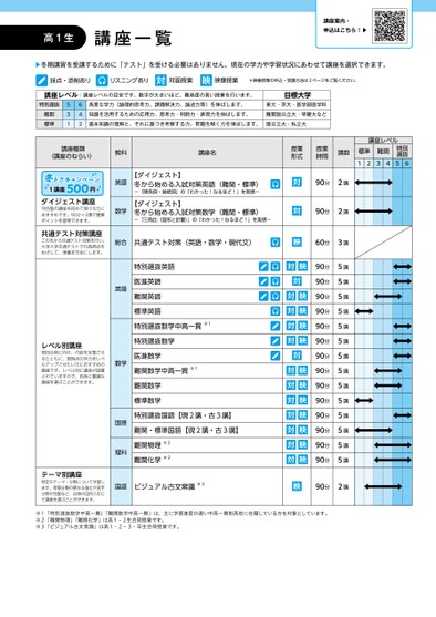 高1生講座一覧講座案内・申込はこちら!▶▶冬期講習を受講するために「テスト」を受ける必要はありません。現在の学力や学習状況にあわせて講座を選択できます。採点・添削ありリスニングあり対対面授業映映像授業*映像授業の申込・受講方法は2ページをご覧ください。講座レベル:講座レベルの目安です。数字が大きいほど、難易度の高い授業を行います。目標大学特別選抜難関標準531642高度な学力(論理的思考力、課題解決力、論述力等)を伸ばします。知識を活用するための応用力、思考力・判断力・表現力を伸ばします。基本知識の理解と、それに基づき考察する力、問題を解く力を伸ばします。東大・京大・医学部医学科難関国公立大・早慶大など国公立大・私立大講座種類(講座のねらい)冬トクキャンペーン5001講座円ダイジェスト講座河合塾の講座を初めて受ける方におすすめです。90分×2講で重要ポイントを習得できます。教科英語数学講座名【ダイジェスト】冬から始める入試対策英語(難関・標準)-「関係詞・接続詞」の「わかった!なるほど!」を実感-【ダイジェスト】冬から始める入試対策数学(難関・標準)-「三角比(図形と計量)」の「わかった!なるほど!」を実感-共通テスト対策講座この冬から共通テスト対策を行い、大学入学共通テストでの高得点をめざして、準備を万全にします。総合共通テスト対策(英語・数学・現代文)講座レベル標準12難関34特別選抜56授業形式授業時間講数対対映90分2講90分2講60分3講対映対対映対映対映対映対対映対映対映対映対映対映対映90分90分90分90分90分90分90分90分90分90分90分90分90分90分5講5講5講5講5講5講5講5講5講5講5講5講5講5講特別選抜英語英語医進英語難関英語標準英語特別選抜数学中高一貫※1特別選抜数学医進数学難関数学中高一貫※1難関数学標準数学特別選抜国語【現2講・古3講】難関・標準国語【現2講・古3講】難関物理※2難関化学※2数学国語理科レベル別講座現役合格に向け、内容を定着させるとともに、現時点の学力をレベルアップさせたい方におすすめの講座です。レベル別に講座が設置されていますので、自身に最適な講座を選ぶことができます。テーマ別講座特定のテーマ・分野について学習します。得意分野の更なる強化や苦手分野の克服など、自身の目的に応じて講座を選ぶことができます。国語ビジュアル古文常識※3映90分2講※1「特別選抜数学中高一貫」「難関数学中高一貫」は、主に学習進度の速い中高一貫制高校に在籍している方を対象としています。※2「難関物理」「難関化学」は高1・2生合同授業です。※3「ビジュアル古文常識」は高1・2・3・卒生合同授業です。