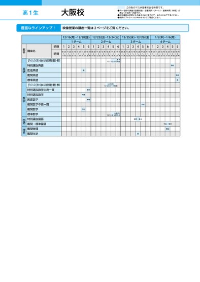●同一名称の講座は設置校舎・設置期間(ターム)・授業時間(時限)が異なっても同一内容です。●担当講師は変更になる場合がありますので、あらかじめご了承ください。●講師のフルネームはWebサイトでご確認ください。この色のマスが授業のある時限です。高1生12/16(月)~12/20(金)12/22(日)~12/24(火)12/25(水)~12/29(日)1/2(木)~1/6(月)1ターム2ターム3ターム4ターム12345612345612345612345609:30〜11:0011:20〜12:5013:40〜15:1015:30〜17:0017:20〜18:5019:10〜20:4009:30〜11:0011:20〜12:5013:40〜15:1015:30〜17:0017:20〜18:5019:10〜20:4009:30〜11:0011:20〜12:5013:40〜15:1015:30〜17:0017:20〜18:5019:10〜20:4009:30〜11:0011:20〜12:5013:40〜15:1015:30〜17:0017:20〜18:5019:10〜20:40時限時間講座名【ダイジェスト】冬から始める入試対策英語(難関・標準)特別選抜英語医進英語難関英語標準英語【ダイジェスト】冬から始める入試対策数学(難関・標準)特別選抜数学中高一貫特別選抜数学医進数学難関数学中高一貫難関数学標準数学特別選抜国語難関・標準国語難関物理難関化学慎寺尾河村涌谷藤野木下12/23の1日完結山本(洋)12/24の1日完結山本(洋)12/24は6限のみ国松清水巽木村畑中・阪上西平田・菅井植田教科英語数学国語理科大阪校豊富なラインアップ!映像授業の講座一覧は2ページをご覧ください。高1生この色のマスが授業のある時限です。●同一名称の講座は設置校舎・設置期間(ターム)・授業時間(時限)が異なっても同一内容です。●担当講師は変更になる場合がありますので、あらかじめご了承ください。●講師のフルネームはWebサイトでご確認ください。●2024年度/冬期講習/近畿/大阪/高1生/パターン14452024_57_5_511_31(1)_20240705160651.csv/1ページ校了時削除