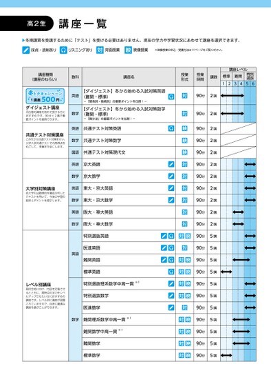 高2生講座一覧▶冬期講習を受講するために「テスト」を受ける必要はありません。現在の学力や学習状況にあわせて講座を選択できます。採点・添削ありリスニングあり対対面授業映映像授業*映像授業の申込・受講方法は11ページをご覧ください。講座名授業形式授業時間講数講座レベル標準12難関34特別選抜56【ダイジェスト】冬から始める入試対策英語(難関・標準)-「関係詞・接続詞」の重要ポイントを伝授!-【ダイジェスト】冬から始める入試対策数学(難関・標準)-「微分法」の重要ポイントを伝授!-講座種類(講座のねらい)冬トクキャンペーン5001講座円ダイジェスト講座河合塾の講座を初めて受ける方におすすめです。90分×2講で重要ポイントを習得できます。教科英語数学共通テスト対策講座この冬から共通テスト対策を行い、大学入学共通テストでの高得点をめざして、準備を万全にします。英語共通テスト対策英語数学共通テスト対策数学国語共通テスト対策現代文英語京大英語数学京大数学大学別対策講座各大学の出題傾向を徹底分析したテキストを用いて、今後の学習の指針とポイントを提示します。英語東大・京大英語数学東大・京大数学英語阪大・神大英語数学阪大・神大数学特別選抜英語英語医進英語難関英語標準英語対対映映映対対対対対対90分2講90分2講90分2講90分2講90分2講90分2講90分2講90分2講90分2講90分2講90分2講対映90分5講対90分5講対映90分5講対映90分5講レベル別講座現役合格に向け、内容を定着させるとともに、現時点の学力をレベルアップさせたい方におすすめの講座です。レベル別に講座が設置されていますので、自身に最適な講座を選ぶことができます。特別選抜理系数学中高一貫※1対映90分5講特別選抜数学医進数学数学難関理系数学中高一貫※1難関数学中高一貫※1難関数学標準数学対映90分5講対90分5講対映90分5講対映90分5講対映90分5講対映90分5講
