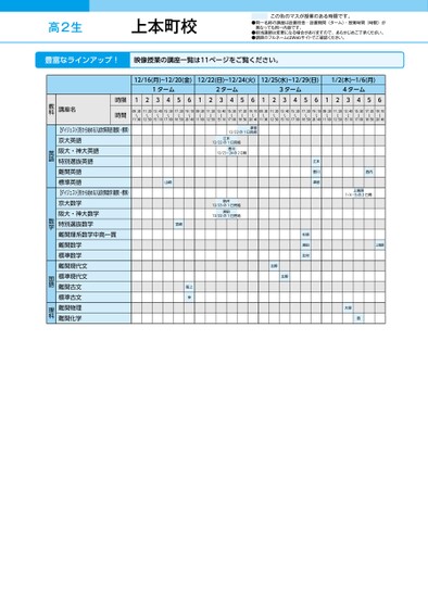 高2生●同一名称の講座は設置校舎・設置期間(ターム)・授業時間(時限)が異なっても同一内容です。●担当講師は変更になる場合がありますので、あらかじめご了承ください。●講師のフルネームはWebサイトでご確認ください。この色のマスが授業のある時限です。12/16(月)~12/20(金)12/22(日)~12/24(火)12/25(水)~12/29(日)1/2(木)~1/6(月)1ターム2ターム3ターム4ターム12345612345612345612345609:30〜11:0011:20〜12:5013:40〜15:1015:30〜17:0017:20〜18:5019:10〜20:4009:30〜11:0011:20〜12:5013:40〜15:1015:30〜17:0017:20〜18:5019:10〜20:4009:30〜11:0011:20〜12:5013:40〜15:1015:30〜17:0017:20〜18:5019:10〜20:4009:30〜11:0011:20〜12:5013:40〜15:1015:30〜17:0017:20〜18:5019:10〜20:40津留12/22の1日完結江本12/22の1日完結香川12/23・24の2日間山崎宮崎駒井12/23の1日完結湘田12/22の1日完結阪上仲江本香川津留西内上高原1/4・5の2日間杉原湘田北村北野北野上高原大學西時限時間講座名教科【ダイジェスト】冬から始める入試対策英語(難関・標準)京大英語阪大・神大英語特別選抜英語難関英語標準英語【ダイジェスト】冬から始める入試対策数学(難関・標準)京大数学阪大・神大数学特別選抜数学難関理系数学中高一貫難関数学標準数学難関現代文標準現代文難関古文標準古文難関物理難関化学英語数学国語理科上本町校豊富なラインアップ!映像授業の講座一覧は11ページをご覧ください。●2024年度/冬期講習/近畿/上本町/高2生/パターン14452024_57_5_513_32_20240705191120.csv/1ページ校了時削除