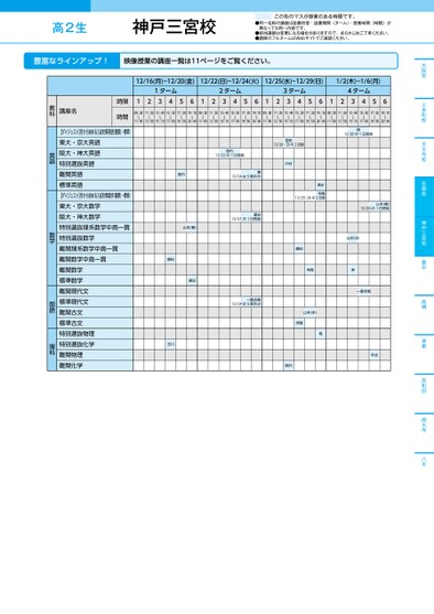 高2生●同一名称の講座は設置校舎・設置期間(ターム)・授業時間(時限)が異なっても同一内容です。●担当講師は変更になる場合がありますので、あらかじめご了承ください。●講師のフルネームはWebサイトでご確認ください。この色のマスが授業のある時限です。大阪校上本町校天王寺校京都校神戸三宮校豊中高槻堺東岸和田西大寺八木12/16(月)~12/20(金)12/22(日)~12/24(火)12/25(水)~12/29(日)1/2(木)~1/6(月)1ターム2ターム3ターム4ターム12345612345612345612345609:30〜11:0011:20〜12:5013:40〜15:1015:30〜17:0017:20〜18:5019:10〜20:4009:30〜11:0011:20〜12:5013:40〜15:1015:30〜17:0017:20〜18:5019:10〜20:4009:30〜11:0011:20〜12:5013:40〜15:1015:30〜17:0017:20〜18:5019:10〜20:4009:30〜11:0011:20〜12:5013:40〜15:1015:30〜17:0017:20〜18:5019:10〜20:40慎12/30の1日完結西内12/22の1日完結堂前12/28・29の2日間中村西内慎12/24は5限のみ涌谷12/21の1日完結一番合戦12/24は5限のみ山本(敏)湘田湘田古川清水寺尾12/25・26の2日間12/25・の2日間山本(敏)12/30の1日完結山本(洋)藤田寺尾岸一番合戦中出山本(ま)伊賀乾岡内時限時間講座名教科【ダイジェスト】冬から始める入試対策英語(難関・標準)東大・京大英語阪大・神大英語特別選抜英語難関英語標準英語【ダイジェスト】冬から始める入試対策数学(難関・標準)東大・京大数学阪大・神大数学特別選抜理系数学中高一貫特別選抜数学難関理系数学中高一貫難関数学中高一貫難関数学標準数学難関現代文標準現代文難関古文標準古文特別選抜物理特別選抜化学難関物理難関化学英語数学国語理科神戸三宮校豊富なラインアップ!映像授業の講座一覧は11ページをご覧ください。●2024年度/冬期講習/近畿/神戸三宮/高2生/パターン14452024_57_5_514_32_20240705191120.csv/1ページ校了時削除