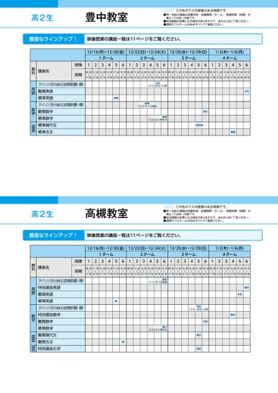 高2生●同一名称の講座は設置校舎・設置期間(ターム)・授業時間(時限)が異なっても同一内容です。●担当講師は変更になる場合がありますので、あらかじめご了承ください。●講師のフルネームはWebサイトでご確認ください。この色のマスが授業のある時限です。12/16(月)~12/20(金)12/22(日)~12/24(火)12/25(水)~12/29(日)1/2(木)~1/6(月)1ターム2ターム3ターム4ターム12345612345612345612345609:30〜11:0011:20〜12:5013:40〜15:1015:30〜17:0017:20〜18:5019:10〜20:4009:30〜11:0011:20〜12:5013:40〜15:1015:30〜17:0017:20〜18:5019:10〜20:4009:30〜11:0011:20〜12:5013:40〜15:1015:30〜17:0017:20〜18:5019:10〜20:4009:30〜11:0011:20〜12:5013:40〜15:1015:30〜17:0017:20〜18:5019:10〜20:40時限時間講座名【ダイジェスト】冬から始める入試対策英語(難関・標準)難関英語標準英語【ダイジェスト】冬から始める入試対策数学(難関・標準)難関数学標準数学標準現代文標準古文津留山内山内12/23・24の2日間2242数野12/22の1日完結数野12/24は5限のみ山内青木一番合戦瀬島教科英語数学国語豊富なラインアップ!映像授業の講座一覧は11ページをご覧ください。豊中教室高2生高槻教室この色のマスが授業のある時限です。●同一名称の講座は設置校舎・設置期間(ターム)・授業時間(時限)が異なっても同一内容です。●担当講師は変更になる場合がありますので、あらかじめご了承ください。●講師のフルネームはWebサイトでご確認ください。12/16(月)~12/20(金)12/22(日)~12/24(火)12/25(水)~12/29(日)1/2(木)~1/6(月)1ターム2ターム3ターム4ターム12345612345612345612345609:30〜11:0011:20〜12:5013:40〜15:1015:30〜17:0017:20〜18:5019:10〜20:4009:30〜11:0011:20〜12:5013:40〜15:1015:30〜17:0017:20〜18:5019:10〜20:4009:30〜11:0011:20〜12:5013:40〜15:1015:30〜17:0017:20〜18:5019:10〜20:4009:30〜11:0011:20〜12:5013:40〜15:1015:30〜17:0017:20〜18:5019:10〜20:40時限時間講座名【ダイジェスト】冬から始める入試対策英語(難関・標準)特別選抜英語難関英語標準英語【ダイジェスト】冬から始める入試対策数学(難関・標準)特別選抜数学難関数学標準数学難関現代文難関古文特別選抜化学堂前12/21の1日完結関口12/24は5限のみ巽堀横井木多駒井中田12/25・26の2日間中田奥村宮路教科英語数学国語理科豊富なラインアップ!映像授業の講座一覧は11ページをご覧ください。●2024年度/冬期講習/近畿/豊中/高2生/パターン14452024_57_5_563_32_20240705182327.csv/1ページ校了時削除