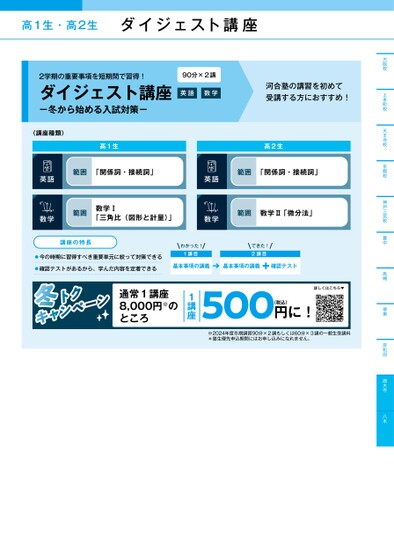 大阪校上本町校天王寺校京都校神戸三宮校豊中高槻堺東岸和田西大寺八木高1生・高2生ダイジェスト講座2学期の重要事項を短期間で習得!ダイジェスト講座-冬から始める入試対策-90分×2講英語数学河合塾の講習を初めて受講する方におすすめ!〈講座種類〉英語数学高1生高2生範囲「関係詞・接続詞」範囲数学Ⅰ「三角比(図形と計量)」範囲「関係詞・接続詞」範囲数学Ⅱ「微分法」英語数学講座の特長今の時期に習得すべき重要単元に絞って対策できる確認テストがあるから、学んだ内容を定着できるわかった!1講目できた!2講目基本事項の講義基本事項の講義確認テスト500異なっても同一内容です。●担当講師は変更になる場合がありますので、あらかじめご了承ください。●講師のフルネームはWebサイトでご確認ください。(税込)円に!※2024年度冬期講習90分×2講もしくは60分×3講の一般生受講料*塾生優先申込期間にはお申し込みになれません。この色のマスが授業のある時限です。●同一名称の講座は設置校舎・設置期間(ターム)・授業時間(時限)が詳しくはこちら▼1講座通常1講座8,000円※のところ高2生