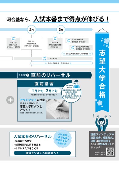 河合塾なら、入試本番まで得点が伸びる!志望大学合格2月入試大学入学共通テスト1/18(土)・19(日)国公立大個別試験出願1/27(月)〜2/5(水)3月入試国公立大前期日程個別試験2/25(火)〜公立大中期日程個別試験3/8(土)〜入試国公立大後期日程個別試験3/12(水)〜入試国公立大合格発表・入学手続き入試私立大入試私立大合格発表・入学手続きSTEP❸直前のリハーサル直前講習1月上旬〜3月上旬映像授業は2/28(金)まで視聴できます。アウトプットの授業(テストゼミ形式)で志望大学にグンと近づく!※講義・演習形式の授業もあります。StudentVoice志望校が同じ生徒と一緒に本番に近い環境でテストを受験!直後の解説で、効率的に学習できました!入試本番のリハーサル・緊張に打ち勝つ・制限時間内に解き終える・ケアレスミスをなくす“入試本番で1点でも多く得点する力”を鍛える自信をつけて入試本番へ!講座ラインアップや設置校舎、授業形式、日程は時間割冊子もしくはWebサイトでチェック!Webサイトでの確認はこちら▶
