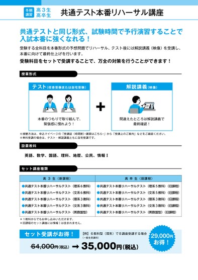 冬期講習高3生高卒生共通テスト本番リハーサル講座共通テストと同じ形式、試験時間で予行演習することで入試本番に強くなれる!受験する全科目を本番形式の予想問題でリハーサル、テスト後には解説講義(映像)を受講し、本番に向けて最終仕上げを行います。受験科目をセットで受講することで、万全の対策を行うことができます!授業形式テスト(校舎受験または自宅受験)解説講義(映像)本番のつもりで取り組んで、緊張感に慣れよう!間違えたところは解説講義で最終確認!※視聴方法は、申込マイページの「受講証(時間割)ー講習はこちらー」から「受講上のご案内」などをご確認ください。※単科受講の場合は、テスト・解説講義ともに自宅受講です。設置教科英語、数学、国語、理科、地歴、公民、情報Ⅰセット講座種類高3生(新課程)高卒生(旧課程)●共通テスト本番リハーサルテスト(理系6教科)●共通テスト本番リハーサルテスト(理系5教科)(旧課程)●共通テスト本番リハーサルテスト(文系6教科)●共通テスト本番リハーサルテスト(文系5教科)(旧課程)●共通テスト本番リハーサルテスト(理系3教科)●共通テスト本番リハーサルテスト(理系3教科)(旧課程)●共通テスト本番リハーサルテスト(文系3教科)●共通テスト本番リハーサルテスト(文系3教科)(旧課程)●共通テスト本番リハーサルテスト(英数国型)●共通テスト本番リハーサルテスト(英数国型)(旧課程)*1教科からでもお申し込みいただけます。*旧課程のセット講座には情報Ⅰは含まれません。セット受講がお得!64,000円(税込)【例】6教科型(理系)で8講座受講する場合(一般生受講料)35,000円(税込)29,000円お得!