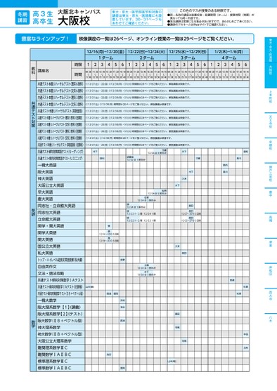 東大・京大・医進館大阪校上本町校天王寺校京都校神戸三宮校豊中高槻堺東岸和田西大寺八木12/16(月)~12/20(金)12/22(日)~12/24(火)12/25(水)~12/29(日)1/2(木)~1/6(月)1ターム2ターム3ターム4ターム12345612345612345612345609:30〜11:0011:20〜12:5013:40〜15:1015:30〜17:0017:20〜18:5019:10〜20:4009:30〜11:0011:20〜12:5013:40〜15:1015:30〜17:0017:20〜18:5019:10〜20:4009:30〜11:0011:20〜12:5013:40〜15:1015:30〜17:0017:20〜18:5019:10〜20:4009:30〜11:0011:20〜12:5013:40〜15:1015:30〜17:0017:20〜18:5019:10〜20:40時限時間講座名教科豊富なラインアップ!映像講座の一覧は26ページ、オンライン授業の一覧は29ページをご覧ください。国松香川西内香川西浦杉原杉原中田北村①12/21(土)・22(日)②12/30(月)・31(火)時間割は●ページをご覧ください。解説講義は映像です。8ページをご覧ください。解説講義は映像です。①12/21(土)・22(日)②12/30(月)・31(火)時間割は●ページをご覧ください。解説講義は映像です。8ページをご覧ください。解説講義は映像です。①12/21(土)・22(日)②12/30(月)・31(火)時間割は●ページをご覧ください。解説講義は映像です。28ページをご覧ください。解説講義は映像です。①12/21(土)②12/30(月)時間割は●ページをご覧ください。解説講義は映像です。8ページをご覧ください。解説講義は映像です。①12/21(土)・22(日)②12/30(月)・31(火)時間割は●ページをご覧ください。解説講義は映像です。8ページをご覧ください。解説講義は映像です。①12/21(土)・22(日)②12/30(月)・31(火)時間割は●ページをご覧ください。解説講義は映像です。8ページをご覧ください。解説講義は映像です。①12/21(土)・22(日)②12/30(月)・31(火)時間割は●ページをご覧ください。解説講義は映像です。8ページをご覧ください。解説講義は映像です。①12/21(土)・22(日)②12/30(月)・31(火)時間割は●ページをご覧ください。解説講義は映像です。28ページをご覧ください。解説講義は映像です。①12/21(土)②12/30(月)時間割は●ページをご覧ください。解説講義は映像です。8ページをご覧ください。解説講義は映像です。①12/21(土)・22(日)②12/30(月)・31(火)時間割は●ページをご覧ください。解説講義は映像です。8ページをご覧ください。解説講義は映像です。木下国松刀12/24は5限のみ木下胡摩﨑12/22は1限のみ刀木下久末木下島田島田12/27〜29の3日間島田12/25〜27の3日間久末島田藤田寺尾寺尾山本(敏)佐野12/24は5限のみ佐野12/24は3限のみ2/24は1限のみ慎12/231・2限/21・2限12/241限2241限慎12/221・2限/21・2限12/231限2231限慎1土橋12/24は3限のみ木下12/24は3限のみ慎慎12/16〜18の3日間慎12/18〜20の3日間山本(敏)西浦信岡池谷佐野河村池谷西浦信岡共通テスト本番リハーサルテスト(理系6教科)共通テスト本番リハーサルテスト(文系6教科)共通テスト本番リハーサルテスト(理系3教科)共通テスト本番リハーサルテスト(文系3教科)共通テスト本番リハーサルテスト(英数国型)共通テスト本番リハーサルテスト(理系5教科)旧課程)共通テスト本番リハーサルテスト(文系5教科)旧課程)共通テスト本番リハーサルテスト(理系3教科)旧課程)共通テスト本番リハーサルテスト(文系3教科)旧課程)共通テスト本番リハーサルテスト(英数国型)旧課程)共通テスト傾向対策英語テスト(リーディング)共通テスト傾向対策英語テスト(リスニング)一橋大英語阪大英語神大英語大阪公立大英語早大英語慶大英語同志社・立命館大英語同志社大英語立命館大英語関学・関大英語関学大英語関大英語国公立大英語私大英語トップ・ハイレベル超長文英語読解(私大編)自由英作文文法・語法攻略共通テスト傾向対策数学ⅠAテスト共通テスト傾向対策数学ⅠAテスト(旧課程)共通テスト傾向対策数学テスト(ⅡB+ベクトル型)一橋大数学阪大理系数学【1】講義)阪大理系数学【2】テスト)阪大数学(ⅡB+ベクトル型)神大理系数学神大数学(ⅡB+ベクトル型)大阪公立大理系数学難関理系数学ⅢC難関数学ⅠAⅡBC標準理系数学ⅢC標準数学ⅠAⅡBC共通テスト対策英語数学●2024年度/冬期講習/近畿/大阪/高3・卒生/パターン14452024_57_5_511_11_20240710164231.csv/1ページ校了時削除冬期講習高3生高卒生大阪北キャンパス大阪校東大・京大・医学部医学科対象の講座は東大・京大・医進館にも設置しています。30・31ページもあわせてご確認ください。この色のマスが授業のある時限です。この色のマスが授業のある時限です。異なっても同一内容です。●同一名称の講座は設置校舎・設置期間(ターム)・授●同一名称の講座は設置校舎・設置期間(ターム)・授業時間(時限)が●担当講師は変更になる場合がありますので、あらかじめ●担当講師は変更になる場合がありますので、あらかじめご了承ください。●講師のフルネームはWebサイトでご確認ください。●講師のフルネームはWebサイトでご確認ください。業時間(時限)が異なっても同一内容です。ご了承ください。