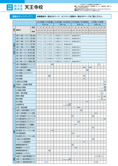 高3生高卒生冬期講習●同一名称の講座は設置校舎・設置期間(ターム)・授業時間(時限)が異なっても同一内容です。●担当講師は変更になる場合がありますので、あらかじめご了承ください。●講師のフルネームはWebサイトでご確認ください。この色のマスが授業のある時限です。①12/21(土)・22(日)②12/30(月)・31(火)時間割は●ページをご覧ください。解説講義は映像です。8ページをご覧ください。解説講義は映像です。①12/21(土)・22(日)②12/30(月)・31(火)時間割は●ページをご覧ください。解説講義は映像です。8ページをご覧ください。解説講義は映像です。①12/21(土)・22(日)②12/30(月)・31(火)時間割は●ページをご覧ください。解説講義は映像です。28ページをご覧ください。解説講義は映像です。①12/21(土)②12/30(月)時間割は●ページをご覧ください。解説講義は映像です。8ページをご覧ください。解説講義は映像です。①12/21(土)・22(日)②12/30(月)・31(火)時間割は●ページをご覧ください。解説講義は映像です。8ページをご覧ください。解説講義は映像です。①12/21(土)・22(日)②12/30(月)・31(火)時間割は●ページをご覧ください。解説講義は映像です。8ページをご覧ください。解説講義は映像です。①12/21(土)・22(日)②12/30(月)・31(火)時間割は●ページをご覧ください。解説講義は映像です。8ページをご覧ください。解説講義は映像です。①12/21(土)・22(日)②12/30(月)・31(火)時間割は●ページをご覧ください。解説講義は映像です。28ページをご覧ください。解説講義は映像です。①12/21(土)②12/30(月)時間割は●ページをご覧ください。解説講義は映像です。8ページをご覧ください。解説講義は映像です。①12/21(土)・22(日)②12/30(月)・31(火)時間割は●ページをご覧ください。解説講義は映像です。8ページをご覧ください。解説講義は映像です。胡摩﨑胡摩﨑江本胡摩﨑胡摩﨑胡摩﨑横井国松西内12/22は6限のみ田村胡摩﨑堂前慎慎津留津留1/4〜6の3日間1/4~6間津留1/2〜4の3日間1/2~4間慎慎1/2〜4の3日間慎1/4〜6の3日間信岡信岡西浦12/16(月)~12/20(金)12/22(日)~12/24(火)12/25(水)~12/29(日)1/2(木)~1/6(月)1ターム2ターム3ターム4ターム12345612345612345612345609:30〜11:0011:20〜12:5013:40〜15:1015:30〜17:0017:20〜18:5019:10〜20:4009:30〜11:0011:20〜12:5013:40〜15:1015:30〜17:0017:20〜18:5019:10〜20:4009:30〜11:0011:20〜12:5013:40〜15:1015:30〜17:0017:20〜18:5019:10〜20:4009:30〜11:0011:20〜12:5013:40〜15:1015:30〜17:0017:20〜18:5019:10〜20:40時限時間講座名教科豊富なラインアップ!映像講座の一覧は26ページ、オンライン授業の一覧は29ページをご覧ください。天王寺校共通テスト本番リハーサルテスト(理系6教科)共通テスト本番リハーサルテスト(文系6教科)共通テスト本番リハーサルテスト(理系3教科)共通テスト本番リハーサルテスト(文系3教科)共通テスト本番リハーサルテスト(英数国型)共通テスト本番リハーサルテスト(理系5教科)旧課程)共通テスト本番リハーサルテスト(文系5教科)旧課程)共通テスト本番リハーサルテスト(理系3教科)旧課程)共通テスト本番リハーサルテスト(文系3教科)旧課程)共通テスト本番リハーサルテスト(英数国型)旧課程)共通テスト傾向対策英語テスト(リーディング)共通テスト傾向対策英語テスト(リスニング)京大英語【1】講義)京大英語【2】テスト)阪大英語神大英語大阪公立大英語同志社・立命館大英語同志社大英語立命館大英語関学・関大英語関学大英語関大英語私大英語自由英作文文法・語法攻略共通テスト傾向対策数学ⅠAテスト共通テスト傾向対策数学ⅠAテスト(旧課程)共通テスト傾向対策数学テスト(ⅡB+ベクトル型)京大理系数学【2】テスト)京大文系数学【2】テスト)阪大理系数学【1】講義)阪大理系数学【2】テスト)阪大数学(ⅡB+ベクトル型)神大理系数学神大数学(ⅡB+ベクトル型)大阪公立大理系数学ハイレベル医進数学難関理系数学ⅢC難関数学ⅠAⅡBC標準理系数学ⅢC標準数学ⅠAⅡBC共通テスト傾向対策国語テスト共通テスト傾向対策現代文テスト共通テスト傾向対策古典テスト共通テスト対策英語数学国語影平上高原影平山本(洋)影平湘田上高原岸影平上高原影平上高原上高原阪上・畑●2024年度/冬期講習/近畿/天王寺/高3・卒生/パターン14452024_57_5_515_11_20240705183532.csv/1ページ校了時削除畑中12/24は5限のみ山本(和)・青野・永松阪上・幸重