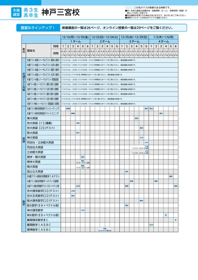 高3生高卒生冬期講習●同一名称の講座は設置校舎・設置期間(ターム)・授業時間(時限)が異なっても同一内容です。●担当講師は変更になる場合がありますので、あらかじめご了承ください。●講師のフルネームはWebサイトでご確認ください。この色のマスが授業のある時限です。12/16(月)~12/20(金)12/22(日)~12/24(火)12/25(水)~12/29(日)1/2(木)~1/6(月)1ターム2ターム3ターム4ターム12345612345612345612345609:30〜11:0011:20〜12:5013:40〜15:1015:30〜17:0017:20〜18:5019:10〜20:4009:30〜11:0011:20〜12:5013:40〜15:1015:30〜17:0017:20〜18:5019:10〜20:4009:30〜11:0011:20〜12:5013:40〜15:1015:30〜17:0017:20〜18:5019:10〜20:4009:30〜11:0011:20〜12:5013:40〜15:1015:30〜17:0017:20〜18:5019:10〜20:40時限時間講座名教科豊富なラインアップ!映像講座の一覧は26ページ、オンライン授業の一覧は29ページをご覧ください。神戸三宮校①12/21(土)・22(日)②12/30(月)・31(火)時間割は●ページをご覧ください。解説講義は映像です。8ページをご覧ください。解説講義は映像です。①12/21(土)・22(日)②12/30(月)・31(火)時間割は●ページをご覧ください。解説講義は映像です。8ページをご覧ください。解説講義は映像です。①12/21(土)・22(日)②12/30(月)・31(火)時間割は●ページをご覧ください。解説講義は映像です。28ページをご覧ください。解説講義は映像です。①12/21(土)②12/30(月)時間割は●ページをご覧ください。解説講義は映像です。8ページをご覧ください。解説講義は映像です。①12/21(土)・22(日)②12/30(月)・31(火)時間割は●ページをご覧ください。解説講義は映像です。8ページをご覧ください。解説講義は映像です。①12/21(土)・22(日)②12/30(月)・31(火)時間割は●ページをご覧ください。解説講義は映像です。8ページをご覧ください。解説講義は映像です。①12/21(土)・22(日)②12/30(月)・31(火)時間割は●ページをご覧ください。解説講義は映像です。8ページをご覧ください。解説講義は映像です。①12/21(土)・22(日)②12/30(月)・31(火)時間割は●ページをご覧ください。解説講義は映像です。28ページをご覧ください。解説講義は映像です。①12/21(土)②12/30(月)時間割は●ページをご覧ください。解説講義は映像です。8ページをご覧ください。解説講義は映像です。①12/21(土)・22(日)②12/30(月)・31(火)時間割は●ページをご覧ください。解説講義は映像です。8ページをご覧ください。解説講義は映像です。胡摩﨑胡摩﨑佐野西内島田島田12/16〜18の3日間島田12/18〜20の3日間山本(敏)山本(敏)湘田木村寺尾12/24は3限のみ島原国松国松堂前島原久末久末久末12/27〜29の3日間12/27~2日間久末12/25~27の3日間1/2〜2の3日間堂前藤野涌谷藤野藤野瀬尾瀬尾藤田岸岸山本(洋)共通テスト本番リハーサルテスト(理系6教科)共通テスト本番リハーサルテスト(文系6教科)共通テスト本番リハーサルテスト(理系3教科)共通テスト本番リハーサルテスト(文系3教科)共通テスト本番リハーサルテスト(英数国型)共通テスト本番リハーサルテスト(理系5教科)旧課程)共通テスト本番リハーサルテスト(文系5教科)旧課程)共通テスト本番リハーサルテスト(理系3教科)旧課程)共通テスト本番リハーサルテスト(文系3教科)旧課程)共通テスト本番リハーサルテスト(英数国型)旧課程)共通テスト傾向対策英語テスト(リーディング)共通テスト傾向対策英語テスト(リスニング)東大英語京大英語【1】講義)京大英語【2】テスト)阪大英語神大英語同志社・立命館大英語同志社大英語立命館大英語関学・関大英語関学大英語関大英語国公立大英語共通テスト傾向対策数学ⅠAテスト共通テスト傾向対策数学ⅠAテスト(旧課程)共通テスト傾向対策数学テスト(ⅡB+ベクトル型)京大理系数学【2】テスト)京大文系数学【2】テスト)阪大理系数学【2】テスト)阪大数学(ⅡB+ベクトル型)神大理系数学神大数学(ⅡB+ベクトル型)難関理系数学ⅢC難関数学ⅠAⅡBC標準数学ⅠAⅡBC共通テスト対策英語数学●2024年度/冬期講習/近畿/神戸三宮/高3・卒生/パターン14452024_57_5_514_11_20240705183518.csv/1ページ校了時削除