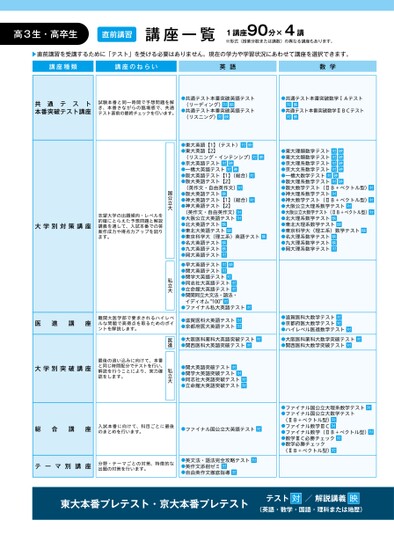 通共ト本番突破テスト講座テス試験本番と同一時間で予想問題を解き、本番さながらの臨場感で、共通テスト直前の最終チェックを行います。●共通テスト本番突破英語テスト(リーディング)対映●共通テスト本番突破英語テスト(リスニング)対映●共通テスト本番突破数学ⅠAテスト対映●共通テスト本番突破数学ⅡBCテスト対映●東大英語【1】(テスト)対映●東大英語【2】(リスニング・インテンシブ)対映●京大英語テスト対映●一橋大英語テスト対映●阪大英語テスト【1】(総合)対●阪大英語テスト【2】(英作文・自由英作文)対●阪大英語テスト映●神大英語テスト【1】(総合)対●神大英語テスト【2】(英作文・自由英作文)対●大阪公立大英語テスト対●北大英語テスト映●東北大英語テスト映●東京科学大(理工系)英語テスト映●名大英語テスト映●九大英語テスト映●岡大英語テスト対●東大理類数学テスト対映●東大文類数学テスト対映●京大理系数学テスト対映●京大文系数学テスト対映●一橋大数学テスト対映●阪大理系数学テスト対映●阪大数学テスト(ⅡB+ベクトル型)対●神大理系数学テスト対●神大数学テスト(ⅡB+ベクトル型)対●大阪公立大理系数学テスト対●大阪公立大数学テスト(ⅡB+ベクトル型)対●北大理系数学テスト映●東北大理系数学テスト映●東京科学大(理工系)数学テスト映●名大理系数学テスト映●九大理系数学テスト映●岡大理系数学テスト対●早大英語テスト対映●関大英語テスト対●関学大英語テスト対●同志社大英語テスト対●立命館大英語テスト対●関関同立大文法・語法・イディオム“100”対●ファイナル私大英語テスト対国公立大私立大大学別対策講座志望大学の出題傾向・レベルを的確にとらえた予想問題と解説講義を通して、入試本番での答案作成力や得点力アップを図ります。●大阪医科薬科大数学突破テスト対●関西医科大数学突破テスト対●大阪医科薬科大英語突破テスト対●関西医科大英語突破テスト対医進医進講座難関大医学部で要求されるハイレベルな問題で高得点を取るためのポイントを解説します。●滋賀医科大英語テスト対●京都府医大英語テスト対●滋賀医科大数学テスト対●京都府医大数学テスト対●ハイレベル医進数学テスト対●関大英語突破テスト対●関学大英語突破テスト対●同志社大英語突破テスト対●立命館大英語突破テスト対私立大大学別突破講座最後の追い込みに向けて、本番と同じ時間配分でテストを行い、解説を行うことにより、実力確認をします。総合講座入試本番に向けて、科目ごとに最後のまとめを行います。●ファイナル国公立大英語テスト対テーマ別講座分野・テーマごとの対策、特徴的な出題の対策を行います。●英文法・語法完全攻略テスト対●英作文添削ゼミ対●自由英作文徹底指導対●ファイナル国公立大理系数学テスト対●ファイナル国公立大数学テスト(ⅡB+ベクトル型)対●ファイナル数学ⅢC対●ファイナル数学(ⅡB+ベクトル型)対●数学ⅢC必勝チェック対●数学必勝チェック(ⅡB+ベクトル型)対東大本番プレテスト・京大本番プレテストテスト/解説講義映対(英語・数学・国語・理科または地歴)高3生・高卒生直前講習講座一覧1講座90分×4講※形式(授業分数または講数)の異なる講座もあります。▶直前講習を受講するために「テスト」を受ける必要はありません。現在の学力や学習状況にあわせて講座を選択できます。講座種類講座のねらい英語数学