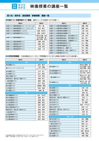 直前講習高3生高卒生映像授業の講座一覧高3生・高卒生直前講習映像授業講座一覧●共通テスト本番突破テスト講座最終チェックで自信をつけて本番へ!講座名共通テスト本番突破英語テスト(リーディング)共通テスト本番突破英語テスト(リスニング)共通テスト本番突破数学ⅠAテスト共通テスト本番突破数学ⅡBCテスト講師名清川舞安井稚乃高梨由多可高梨由多可共通テスト本番突破国語テスト共通テスト本番突破物理テスト共通テスト本番突破化学テスト共通テスト本番突破生物テスト共通テスト本番突破地学テスト(現代文)松藤央記(古文)阿部順(漢文)伊藤恭平加藤武昭岡島卓也三浦友史田島一成講座名共通テスト本番突破物理基礎テスト共通テスト本番突破化学基礎テスト共通テスト本番突破生物基礎テスト共通テスト本番突破地学基礎テスト共通テスト本番突破歴史総合,日本史探究テスト共通テスト本番突破歴史総合,世界史探究テスト共通テスト本番突破地理総合,地理探究テスト共通テスト本番突破歴史総合テスト共通テスト本番突破地理総合テスト共通テスト本番突破公共,倫理テスト共通テスト本番突破公共,政治・経済テスト共通テスト本番突破公共テスト●大学別対策講座入試本番前のリハーサル!予想問題のテストゼミと解説で自信をつけて入試本番へ。講師名加藤武昭岡島卓也三浦友史田島一成大内恭子坂本新一中井隆顕井上徳子中井隆顕平川唯史河合英次吉見直倫講師名講座名英語東大英語テスト東大リスニングインテンシブ京大英語テスト北大英語テスト東北大英語テスト東京科学大(理工系)英語テスト一橋大英語テスト名大英語テスト阪大英語テスト九大英語テスト早大英語テスト数学東大理類数学テスト東大文類数学テスト京大理系数学テスト京大文系数学テスト北大理系数学テスト東北大理系数学テスト東京科学大(理工系)数学テスト一橋大数学テスト名大理系数学テスト阪大理系数学テスト九大理系数学テスト講師名高沢節子久恒秀雄クレア・ジャンセン江本祐一松山博史竹内利光仲野秀人新野元基宮下卓也胡摩﨑章秀柴田祐樹髙橋慶刈谷今比古岡田純一西浦高志藤野真也福井敏英木村文彦香坂季京飯田忠司小田裕介涌谷俊之野竿陽司*担当講師は変更になる場合がありますので、あらかじめご了承ください。*講数・分数は講座により異なります。Webサイトをご確認ください。講座名国語東大国語テスト京大理系国語テスト京大文系国語テスト一橋大国語テスト早大国語テスト理科東大物理テスト京大物理テスト北大物理テスト東北大物理テスト東京科学大(理工系)物理テスト東大化学テスト京大化学テスト北大化学テスト東北大化学テスト東京科学大(理工系)化学テスト東大生物テスト北大生物テスト地歴・公民東大日本史テスト京大日本史テスト一橋大日本史テスト東大世界史テスト京大世界史テスト一橋大世界史テスト東大地理テスト京大地理テスト(現代文)斎藤淳(古文)藤澤咲良(漢文)髙橋佳典(現代文)中崎学(古文)松尾佳津子(現代文)三河隆之(古文)園明美(漢文)髙橋佳典(現代文)一瀬文孝(古文)阿部順小野仁彦乾雅博島村誠渡部大嗣田辺久寺田大介西章嘉高田マサカズ寺田大介安達弘行向井亮向井亮坂本勝義宮本晋平依田文人坂本新一井上徳子髙岡慎太郎伊藤彰芳河野貴樹