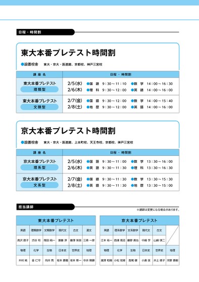 日程・時間割東大本番プレテスト時間割●設置校舎東大・京大・医進館、京都校、神戸三宮校講座名東大本番プレテスト理類型東大本番プレテスト文類型日程・時間割2/5(水)●国語2/6(木)●理科2/7(金)●国語2/8(土)●地歴9:30〜11:109:30〜12:00●数学●英語14:00〜16:3014:00〜16:009:30〜12:009:30〜12:00●数学●英語14:00〜15:4014:00〜16:00京大本番プレテスト時間割●設置校舎東大・京大・医進館、上本町校、天王寺校、京都校、神戸三宮校講座名日程・時間割京大本番プレテスト理系型2/5(水)●国語2/6(木)●英語9:30〜11:009:30〜11:30●数学●理科13:30〜16:0013:30〜16:30京大本番プレテスト文系型2/7(金)●国語2/8(土)●英語9:30〜11:309:30〜11:30●数学●地歴13:30〜15:3013:30〜15:00担当講師※講師は変更になる場合があります。東大本番プレテスト京大本番プレテスト英語理類数学文類数学現代文古文漢文英語理系数学文系数学現代文古文高沢節子渋谷司岡田純一斎藤淳藤澤咲良三森一彦江本祐一西浦高志藤野真也中崎学山崎瑛二物理化学生物日本史世界史地理物理化学生物日本史世界史地理木村純金仁守向井亮坂本勝義坂本新一中井隆顕瀧澤和樹小松知修西尾健小倉匡井上徳子河野貴樹