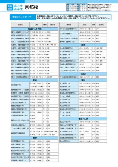 高3生高卒生直前講習時限時間時間1限2限3限9:10〜10:4011:00〜12:3013:10〜14:4015:00〜16:3017:20〜18:5019:10〜20:40時限4限5限6限●同一名称の講座は設置校舎・設置期間・授業時間(時限)が異なっても同一内容です。●担当講師は変更になる場合がありますので、あらかじめご了承ください。●講師のフルネームはWebサイトでご確認ください。京都校豊富なラインアップ!映像講座の一覧は52ページ、オンライン授業の一覧は55ページをご覧ください。東大・京大合格のための必須講座!東大・京大本番プレテストは53・54ページをご覧ください。講座名日程時限講師名講座名日程時限講師名共通テスト対策共通テスト本番突破英語テスト(リーディング)1/13(月・祝)09:30〜12:50谷共通テスト本番突破英語テスト(リスニング)1/13(月・祝)13:40〜15:20谷ファイナル国公立大理系数学テスト2/13(木)・2/14(金)3・4山下ファイナル数学ⅢC1/25(土)・1/26(日)・/2(火1・25杉原1/25(土)・1/26(日)・/2(火1・25杉原共通テスト本番突破数学ⅠAテスト1/9(木)10:30〜13:20上村ファイナル数学(ⅡB+ベクトル型)1/21(火)・1/22(水)1・2瀬古共通テスト本番突破数学ⅡBCテスト1/8(水)13:00〜15:50山本(敏)数学ⅢC必勝チェック1/25(土)・1/26(日)5・6瀬戸山共通テスト本番突破国語テスト1/12(日)12:40〜18:30奥村・伊賀・畑国語共通テスト本番突破物理テスト1/10(金)15:20〜18:00大學共通テスト本番突破物理基礎テスト1/10(金)13:20〜15:00大學共通テスト本番突破化学テスト1/7(火)15:00〜17:40大野共通テスト本番突破化学基礎テスト1/11(土)15:20〜17:00大野共通テスト本番突破生物テスト1/11(土)14:30〜17:10加賀共通テスト本番突破生物基礎テスト1/11(土)13:10〜14:50中井京大理系国語テスト京大文系国語テスト阪大国語テスト神大国語テスト2/1(土)・2/2(日)1・2中崎・伊賀2/3(月)・2/4(火)5・6中崎・伊賀2/13(木)・2/14(金)1・2中崎・仲2/13(木)・2/14(金)3・4中崎・仲・幸重同志社大国語突破テスト立命館大国語突破テスト1/27(月)1/21(火)4・53青木・塚野4・53江濵・塚野共通テスト本番突破地学基礎テスト1/11(土)10:50〜12:30松永ファイナル国公立大現代文テスト2/11(火・祝)・2/12(水)1・2中崎共通テスト本番突破歴史総合,日本史探究テスト1/11(土)18:50〜21:30小倉ファイナル国公立大古文テスト2/17(月)・2/18(火)3・4塚野共通テスト本番突破歴史総合,世界史探究テスト1/12(日)18:50〜21:30上住小論文共通テスト本番突破地理総合,地理探究テスト1/13(月・祝)18:50〜21:30河野ファイナル国公立大看護・医療系対策小論文テスト2/9(日)・2/10(月)3・4加賀京大英語テスト英語1/27(月)・1/28(火)5・6島原2/11(火・祝)・2/12(水)3・4佐野阪大英語テスト【1】総合)2/15(土)・2/16(日)5・6堂前京大物理テスト阪大物理テスト神大物理テスト理科1/25(土)・1/26(日)3・4瀧澤2/13(木)・2/14(金)3・4瀧澤2/17(月)・2/18(火)3・4吉田阪大英語テスト【2】英作文・自由英作文)2/11(火・祝)・2/12(水)1・2片山国公立大医系物理テスト2/13(木)・2/14(金)5・6瀧澤神大英語テスト【1】総合)2/11(火・祝)・2/12(水)3・4谷神大英語テスト【2】英作文・自由英作文)2/15(土)・2/16(日)3・4久末大阪公立大英語テスト2/15(土)・2/16(日)3・4谷同志社大英語テスト1/27(月)・1/28(火)5・6谷ファイナル物理京大化学テスト阪大化学テスト神大化学テスト1/23(木)・1/24(金)3・4瀧澤2/1(土)・2/2(日)3・4小松2/17(月)・2/18(火)3・4本瀬2/17(月)・2/18(火)1・2本瀬同志社大英語突破テスト1/24(金)5・6谷国公立大医系化学テスト2/11(火・祝)・2/12(水)3・4小松立命館大英語テスト1/23(木)・1/24(金)1・2谷立命館大英語突破テスト関関同立大文法・語法・イディオム“100”1/26(日)1/16(木)1/26(日)5・6谷3・4谷3・4谷京都府医大英語テスト2/17(月)・2/18(火)3・4島原ファイナル国公立大英語テスト2/15(土)・2/16(日)5・6木下ファイナル化学ファイナル生物1/21(火)・1/22(水)3・4大野1/23(木)・1/24(金)3・4加賀地歴・公民京大日本史テスト1/23(木)・1/24(金)5・6横内同志社大日本史突破テスト1/22(水)立命館大日本史突破テスト1/23(木)3・4小倉3・4高木自由英作文徹底指導1/23(木)3・4限、2/11(火・祝)5・6限島原京大世界史テスト2/1(土)・2/2(日)5・6上住1/26(日)3・4限、2/12(水)1・2限白井同志社大世界史突破テスト1/24(金)数学立命館大世界史突破テスト1/22(水)3・4澤田5・6前田京大地理テスト1/23(木)・1/24(金)5・6高松京大理系数学テスト京大文系数学テスト阪大理系数学テスト1/29(水)・1/30(木)5・6藤野1/29(水)・1/30(木)5・6山下2/13(木)・2/14(金)1・2河村阪大数学テスト(ⅡB+ベクトル型)2/13(木)・2/14(金)3・4瀬尾神大理系数学テスト2/15(土)・2/16(日)5・6藤田神大数学テスト(ⅡB+ベクトル型)2/13(木)・2/14(金)1・2瀬古京都府医大数学テスト2/13(木)・2/14(金)3・4瀬古