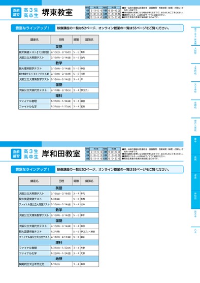 東大・京大・医進館大阪校上本町校天王寺校京都校神戸三宮校豊中高槻堺東岸和田西大寺八木堺東教室豊富なラインアップ!映像講座の一覧は52ページ、オンライン授業の一覧は55ページをご覧ください。講座名日程時限講師名英語阪大英語テスト【1】総合)2/15(土)・2/16(日)5・6青木大阪公立大英語テスト2/13(木)・2/14(金)5・6山内数学阪大理系数学テスト2/13(木)・2/14(金)5・6中田阪大数学テスト(ⅡB+ベクトル型)2/13(木)・2/14(金)5・6杉原大阪公立大理系数学テスト2/13(木)・2/14(金)3・4岸国語大阪公立大現代文テスト2/17(月)・2/18(火)3・4野口(た)理科ファイナル物理ファイナル化学1/23(木)・1/24(金)3・4植田1/21(火)・1/22(水)3・4宮路直前講習高3生高卒生岸和田教室時限1限2限3限時間9:10〜10:4011:00〜12:3013:10〜14:40時限4限5限6限時間15:00〜16:3017:20〜18:5019:10〜20:40●同一名称の講座は設置校舎・設置期間・授業時間(時限)が異なっても同一内容です。●担当講師は変更になる場合がありますので、あらかじめご了承ください。●講師のフルネームはWebサイトでご確認ください。●現役生教室の受講対象は高3生のみです。豊富なラインアップ!映像講座の一覧は52ページ、オンライン授業の一覧は55ページをご覧ください。講座名日程時限講師名英語大阪公立大英語テスト2/15(土)・2/16(日)3・4千代関大英語突破テスト1/24(金)5・6敦見ファイナル国公立大英語テスト2/13(木)・2/14(金)3・4松井数学大阪公立大理系数学テスト2/13(木)・2/14(金)5・6影平国語大阪公立大現代文テスト2/13(木)・2/14(金)3・4中田関大国語突破テスト1/27(月)5・6野口(た)・瀬島ファイナル国公立大古文テスト2/11(火・祝)・2/12(水)13木)2/4(金)3・456阪上理科ファイナル物理ファイナル化学1/21(火)・1/22(水)5・634大學1/23(木)・1/24(金)3・4大野地歴関関同立大日本文化史1/21(火)3・4中田