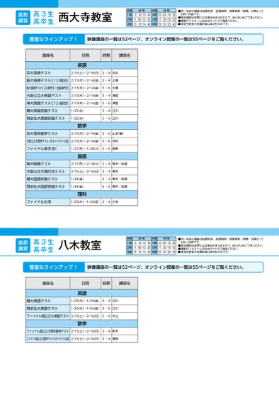 西大寺教室豊富なラインアップ!映像講座の一覧は52ページ、オンライン授業の一覧は55ページをご覧ください。講座名日程時限講師名英語京大英語テスト2/15(土)・2/16(日)3・4白井阪大英語テスト【1】総合)2/13(木)・2/14(金)3・4土橋阪大英語テスト【2】英作文・自由英作文)2/13(木)・2/14(金)5・6土橋大阪公立大英語テスト2/13(木)・2/14(金)3・4津留神大英語テスト【1】総合)2/13(木)・2/14(金)5・6津留関大英語突破テスト同志社大英語突破テスト1/22(水)1/22(水)数学3・4江川5・6江川京大理系数学テスト2/13(木)・2/14(金)5・6山本(敏)大阪公立大数学テスト(ⅡB+ベクトル型)2/13(木)・2/14(金)5・6河村ファイナル数学ⅢC1/27(月)・1/28(火)5・6数野国語阪大国語テスト2/17(月)・2/18(火)3・4青木・松尾大阪公立大現代文テスト2/15(土)・2/16(日)3・4青木関大国語突破テスト同志社大国語突破テスト1/24(金)1/24(金)理科3・4青木・松尾5・6青木・松尾ファイナル化学1/23(木)・1/24(金)3・4小松直前講習高3生高卒生八木教室時限1限2限3限時間9:10〜10:4011:00〜12:3013:10〜14:40時限4限5限6限時間15:00〜16:3017:20〜18:5019:10〜20:40●同一名称の講座は設置校舎・設置期間・授業時間(時限)が異なっても同一内容です。●担当講師は変更になる場合がありますので、あらかじめご了承ください。●講師のフルネームはWebサイトでご確認ください。●現役生教室の受講対象は高3生のみです。豊富なラインアップ!映像講座の一覧は52ページ、オンライン授業の一覧は55ページをご覧ください。講座名日程時限講師名英語関大英語テスト同志社大英語テスト1/23(木)・1/24(金)3・4江川1/23(木)・1/24(金)5・6江川ファイナル国公立大英語テスト2/15(土)・2/16(日)5・6片山数学ファイナル国公立大理系数学テスト2/15(土)・2/16(日)3・4影平ファイナル国公立大数学テスト(ⅡB+ベクトル型)2/15(土)・2/16(日)3・4信岡