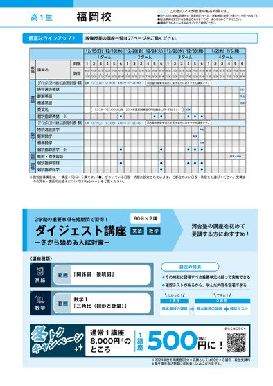 高1生●同一名称の講座は設置校舎・設置期間(ターム)・授業時間(時限)が異なっても同一内容です。●担当講師は変更になる場合がありますので、あらかじめご了承ください。●講師のフルネームはWebサイトでご確認ください。この色のマスが授業のある時限です。12/15(日)~12/19(木)12/20(金)~12/24(火)12/26(木)~12/30(月)1/2(木)~1/6(月)1ターム2ターム3ターム4ターム12345612345612345612345609:30〜11:0011:20〜12:5013:40〜15:1015:30〜17:0017:20〜18:5019:10〜20:4009:30〜11:0011:20〜12:5013:40〜15:1015:30〜17:0017:20〜18:5019:10〜20:4009:30〜11:0011:20〜12:5013:40〜15:1015:30〜17:0017:20〜18:5019:10〜20:4009:30〜11:0011:20〜12:5013:40〜15:1015:30〜17:0017:20〜18:5019:10〜20:40時限時間講座名教科福岡校山﨑12/23(月)・12/24(火)6限(19:10〜20:40)2/23()・1/4()9:10~040河合塾の授業を初めて受ける方におすすめの講座です。12/28~12/30の3日間2024年度夏期講習の同名講座と同一内容です。杉本●●●●●●12/21(土)・12/22(日)坪1/21(・1/22(日)6限(19:10〜20:40)9:10~040河合塾の授業を初めて受ける方におすすめの講座です。●●●●●龍頭戸田石原●●●●●●●堤(英)久我加藤岡本・寺島※【ダイジェスト】冬から始める入試対策英語(難関・標準)特別選抜英語難関英語標準英語英文法個別指導英語【ダイジェスト】冬から始める入試対策数学(難関・標準)特別選抜数学難関数学標準数学個別指導数学難関・標準国語個別指導物理個別指導化学※英語数学国語理科※個別指導講座は、1講座:90分×5講です。「●」がついている日程・時限に設定されています。ご都合のよい日程・時限をお選びください。受講までの流れ・講座の仕組みについてはWebページをご覧ください。●2024年度/冬期講習/九州/福岡校/高1生/パターン14452024_57_7_711_31_20240710182809.csv/1ページ校了時削除
